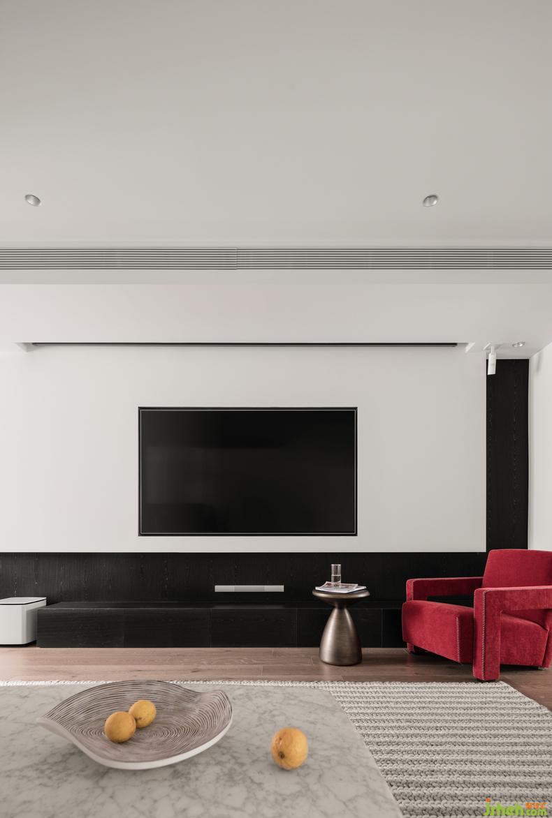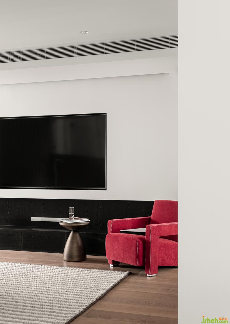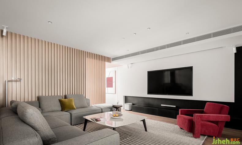 采用紅色沙發(fā)作為跳色,給人感覺(jué)猶如是大自然中的一抹紅光,為客廳增添了溫暖的舒適感。