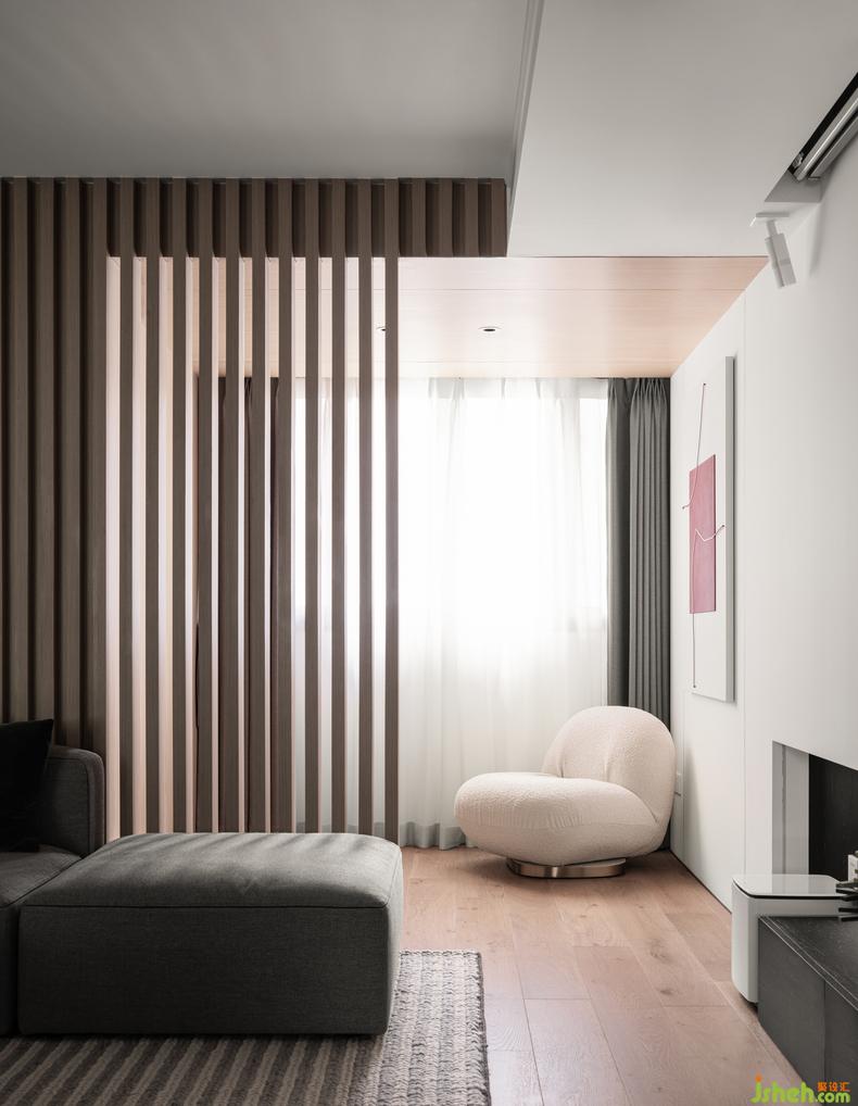 客廳與休閑陽(yáng)臺(tái)之間沒(méi)有用傳統(tǒng)的玻璃移門(mén)遮住它,裝修設(shè)計(jì)而是采用木格柵的設(shè)計(jì)手法,增加光影效果,保證空間的通透性,讓整個(gè)空間享受著陽(yáng)光的撫摸。