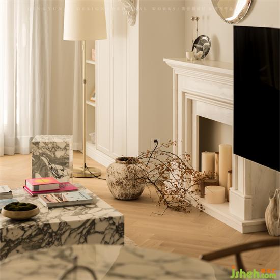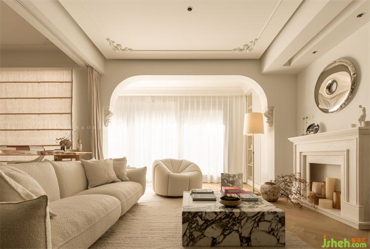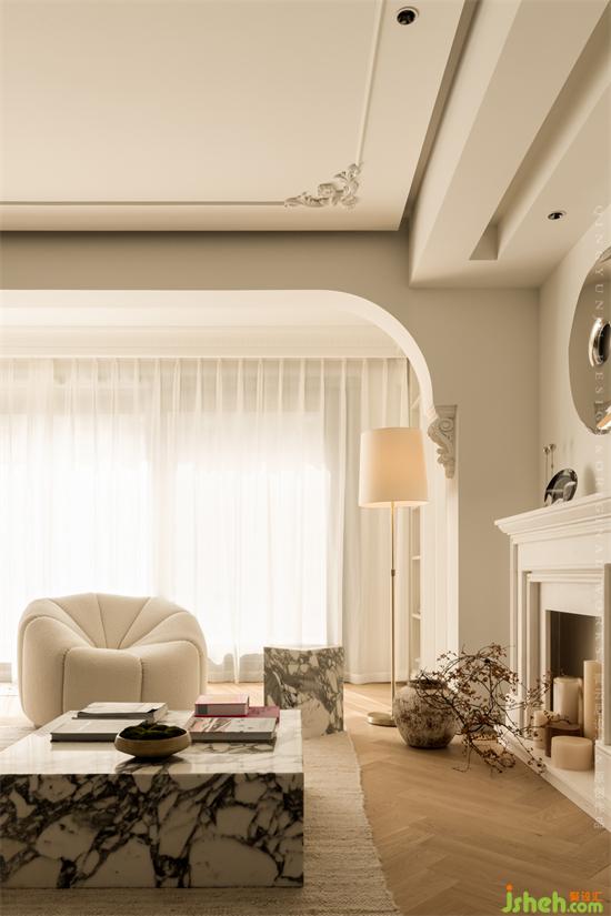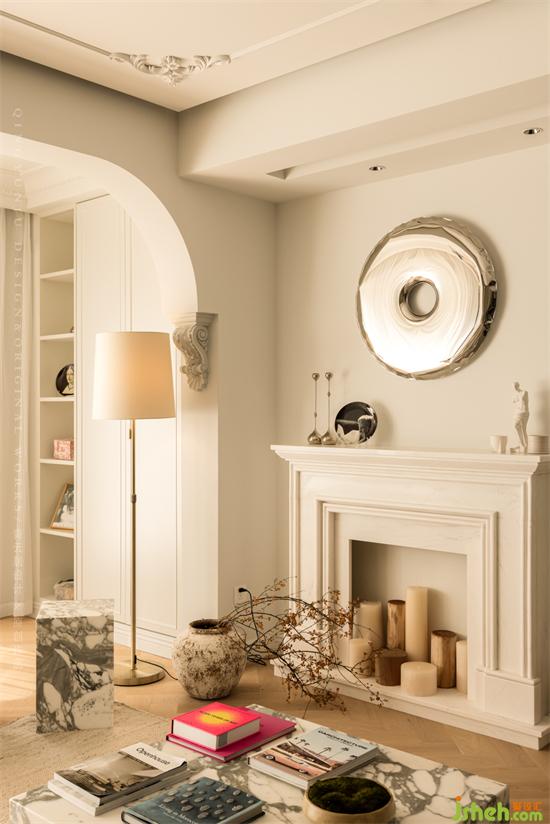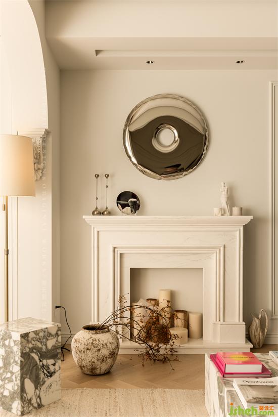 杭州錦麟府裝修設計獨特的雕花造型+弧形元素,體現(xiàn)出經典的法式風,裝飾壁爐+圓形金屬裝飾品,將現(xiàn)代元素恰到好處地融入法式風。