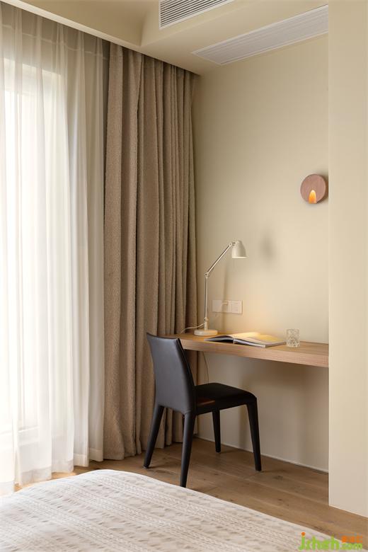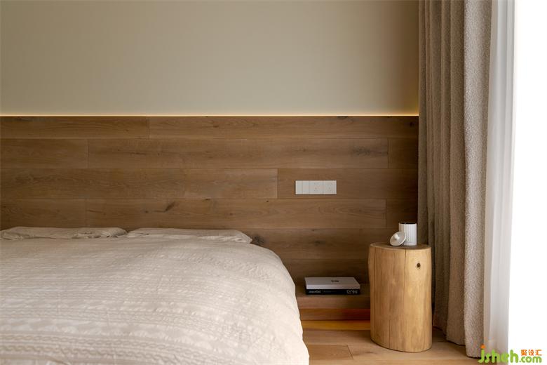 臥室墻面以米色為主,地板和背景墻采用木板裝飾,搭配暖色燈帶,杭州水岸楓庭家裝設(shè)計(jì)整體沒(méi)有繁雜的裝飾,自然紋理讓空間兼具了藝術(shù)美感。