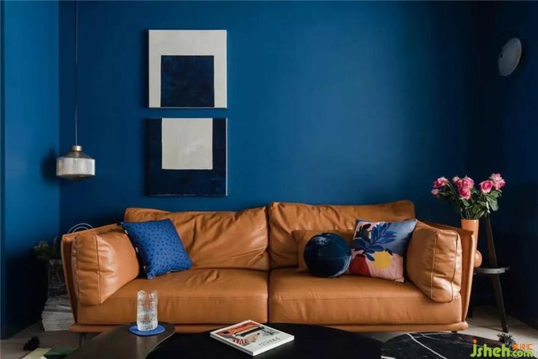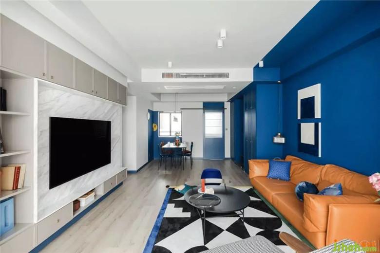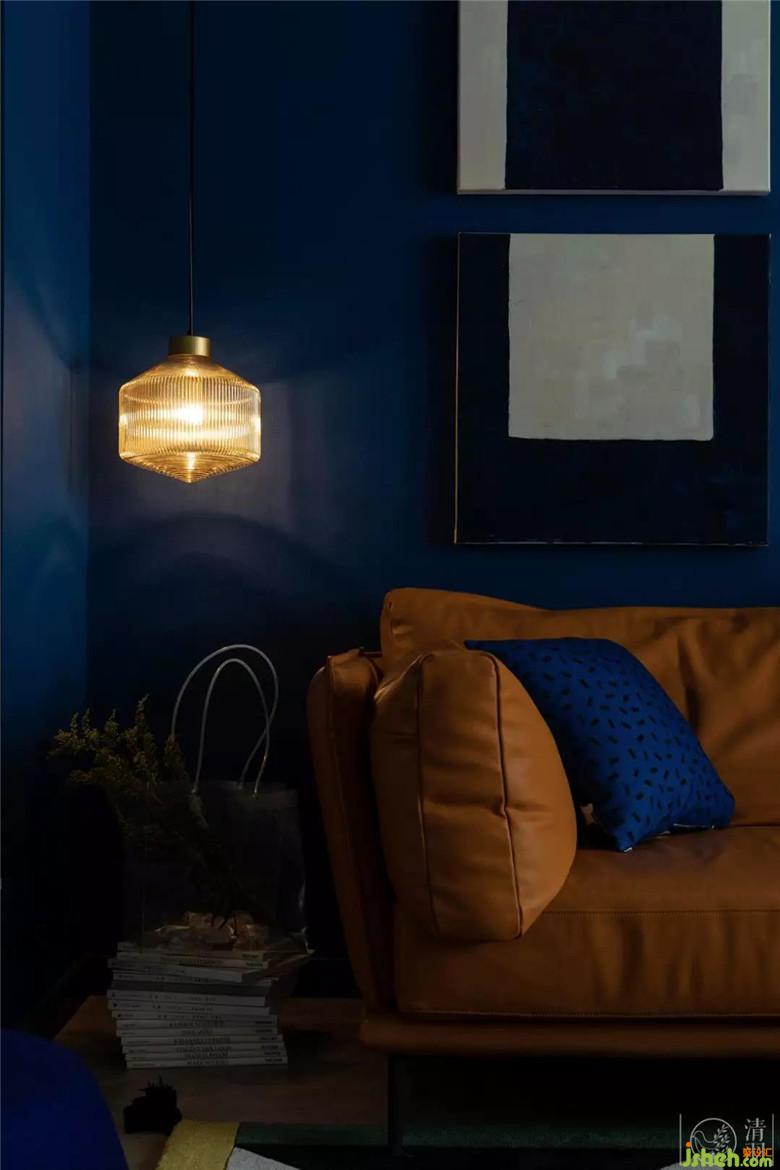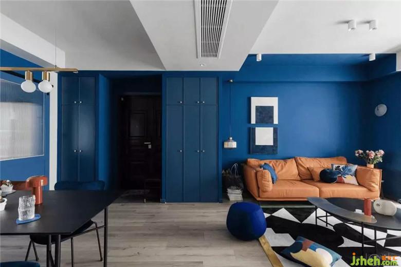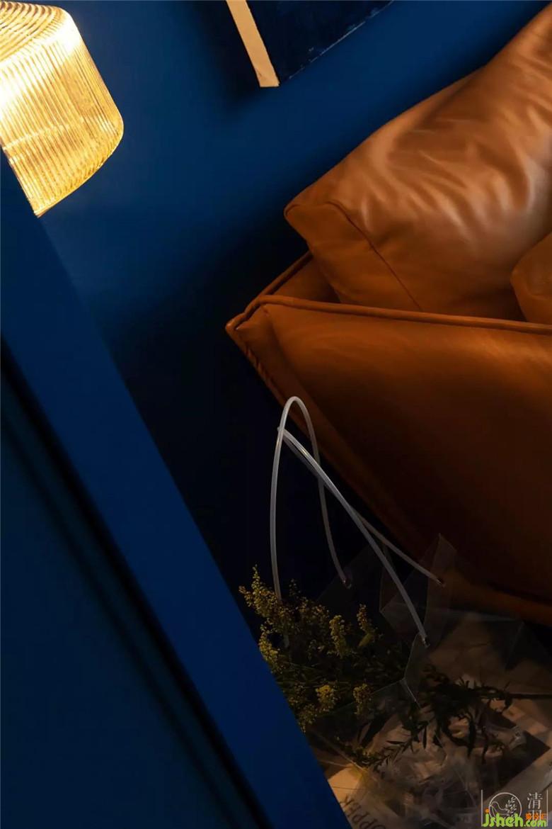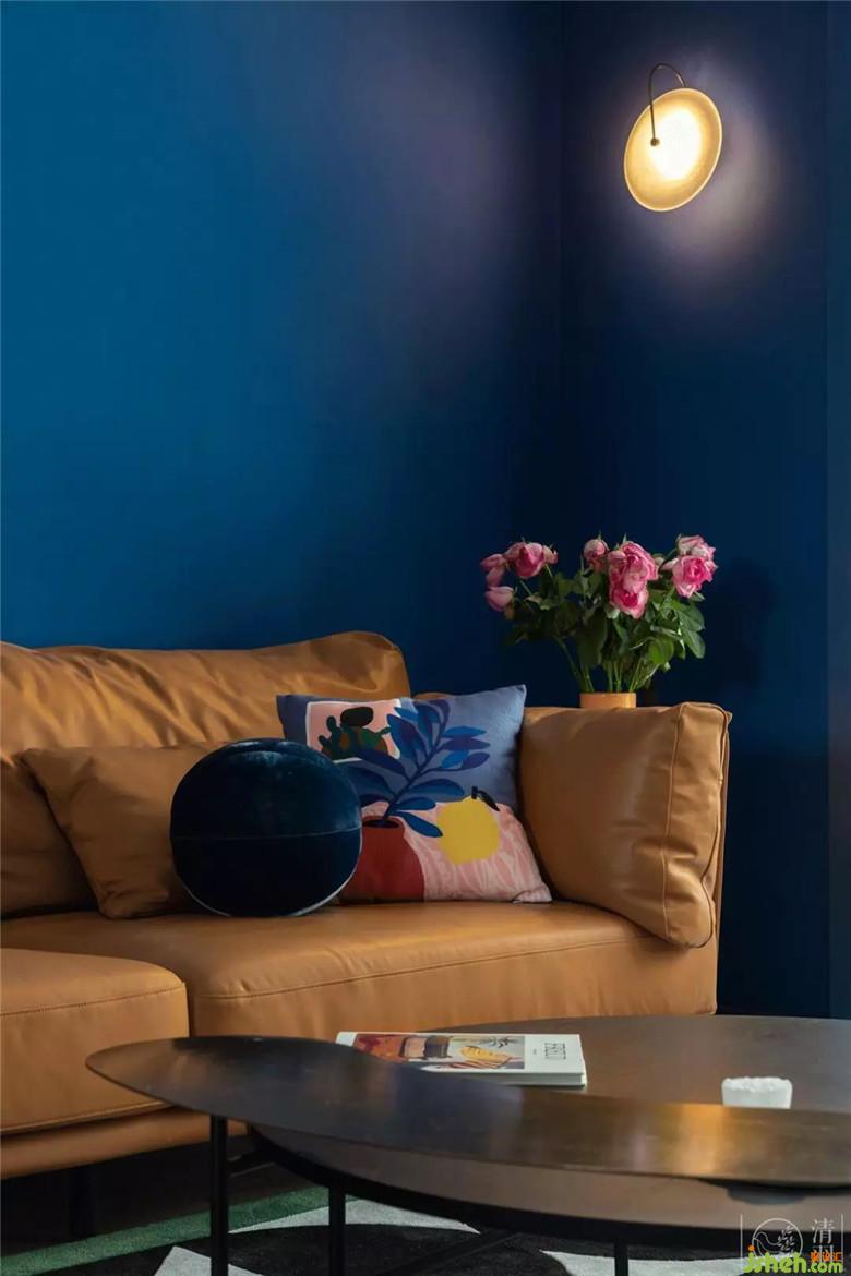 客廳墻面以克萊因藍(lán)為底色,搭配淺灰色木地板,以及白色極簡的頂面設(shè)計,整個空間是無限的,是充滿容納力的。