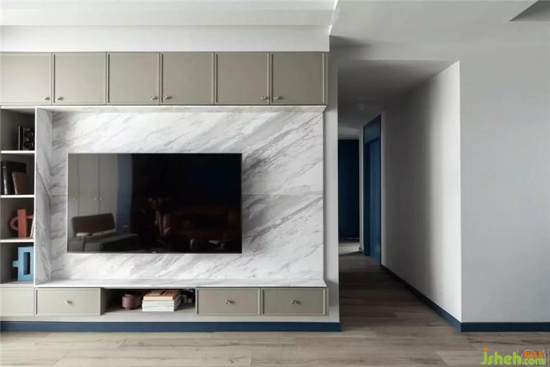 入戶在收納上做足了功夫,藍(lán)色收納柜嵌入在藍(lán)色墻壁中,兼具美觀和實用性。