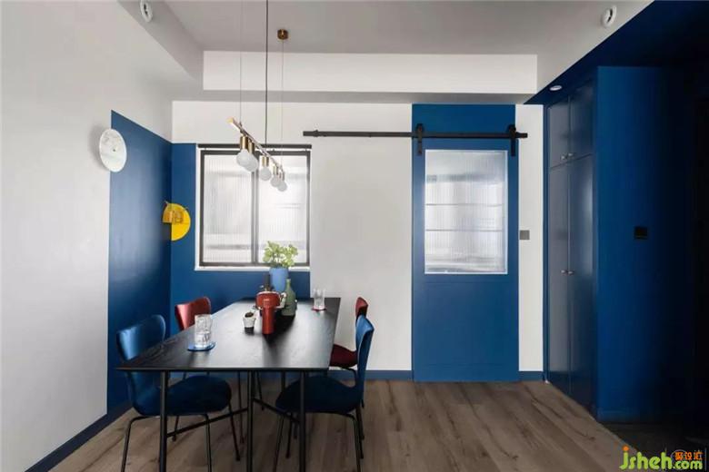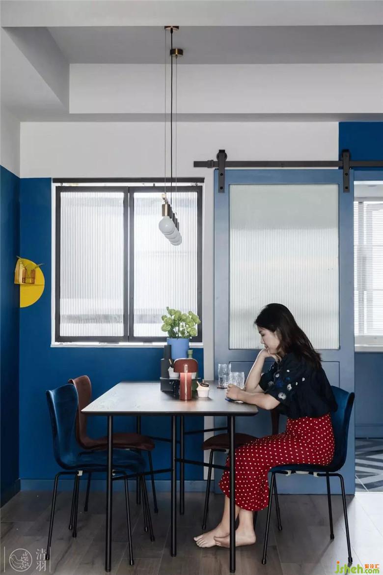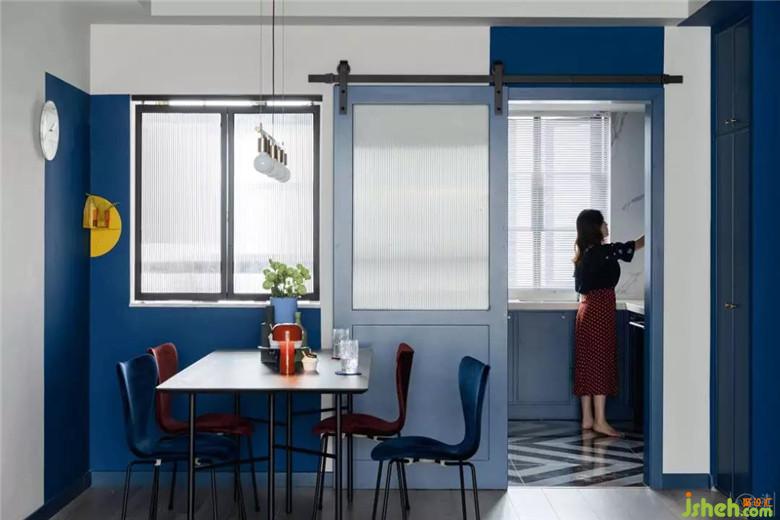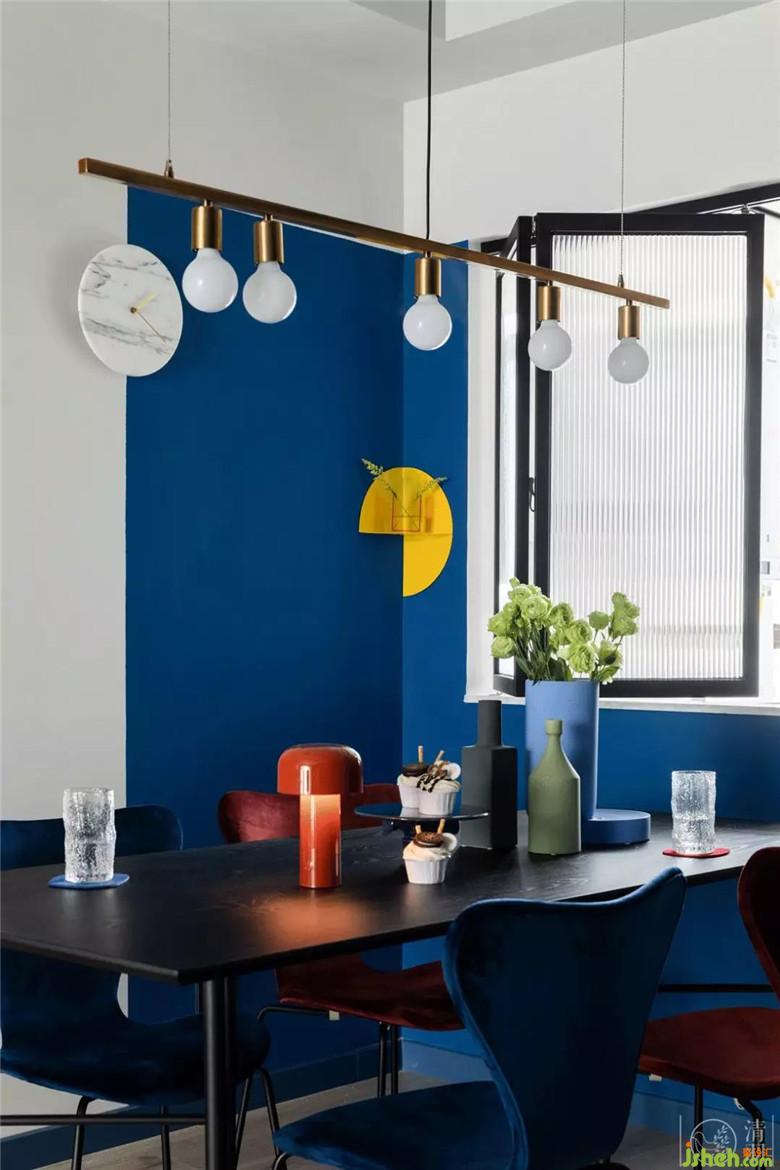 絲絨餐椅是酒紅色和藏藍(lán)色混搭著選擇的,配合餐桌上淺藍(lán)、深藍(lán)和綠色點(diǎn)綴的裝飾,讓整個(gè)餐廳都通透而潔凈。