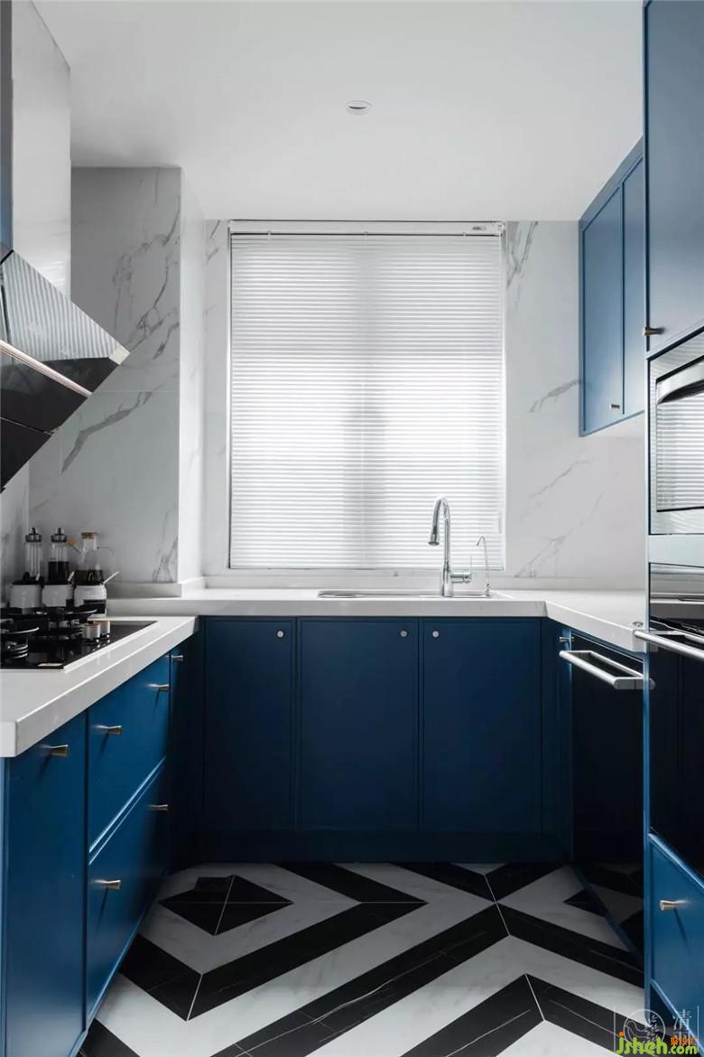 廚房的地面呼應(yīng)客廳的地毯,沿用黑白幾何元素,搭配藍(lán)色廚柜,增添一絲摩登而前衛(wèi)的視覺(jué)感受。