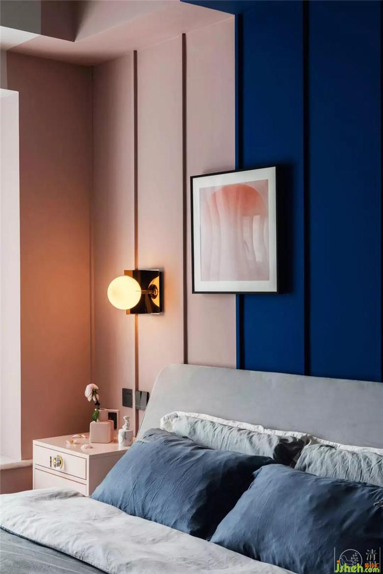 主臥選用淺粉色、淺灰色來(lái)補(bǔ)充藍(lán)色,在純凈浪漫的基礎(chǔ)上,調(diào)和出溫暖的味道。