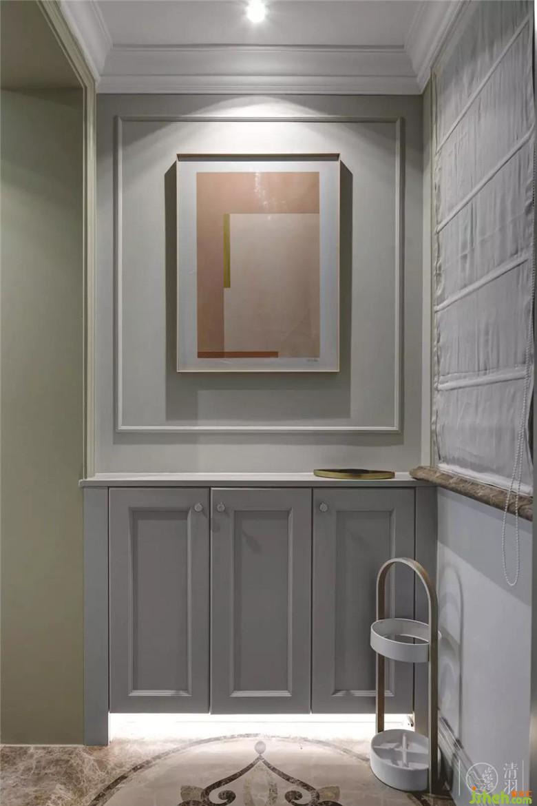 淺灰的墻面搭配同色的鞋柜,玄關(guān)的一角再添置了一個(gè)造型收納架,以方便主人隨手放置一些小型物件。而一側(cè)垂掛的簾子為整個(gè)家點(diǎn)染了些許私密的氛圍。