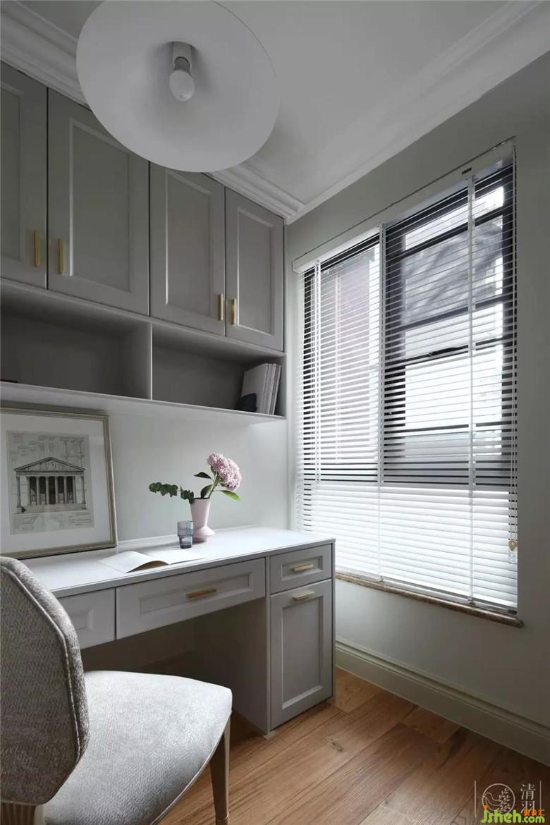 書(shū)房間采用無(wú)彩色和自然色,柔和溫暖的日光從一側(cè)的簾間傾灑下來(lái),頂燈就如一朵倒懸綻放的喇叭花。空間之中流瀉著溫馨靜謐的氛圍。