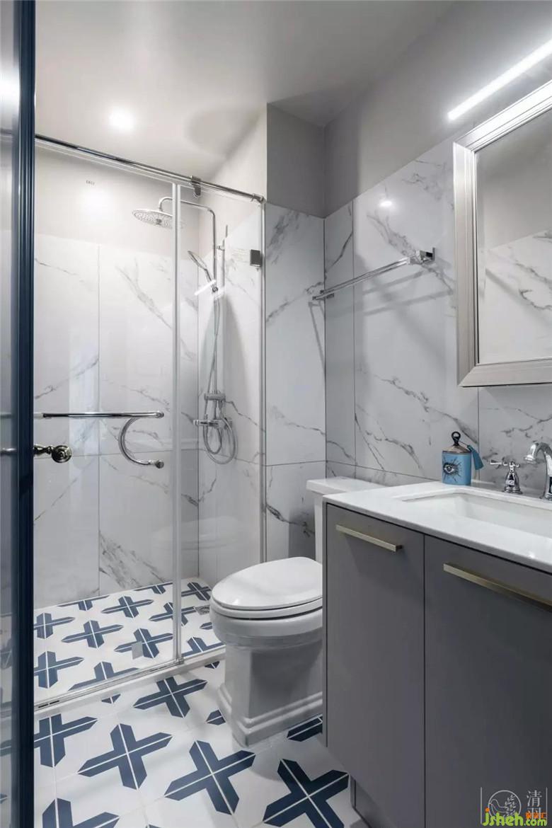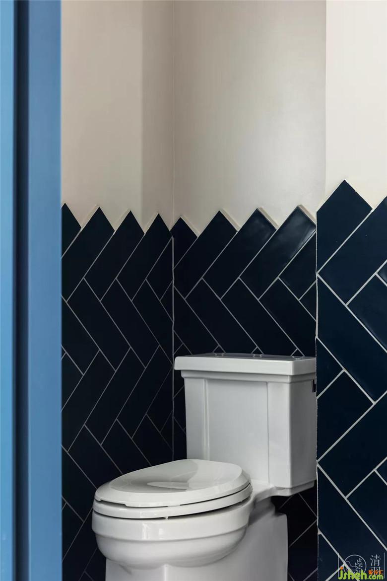 次衛(wèi),女兒房的用了梵高桃花粉和星空藍(lán)來(lái)做瓷磚的選擇,人字鋪貼的方式也讓空間在視覺(jué)感受上變得不再狹小,有趣而雅致。