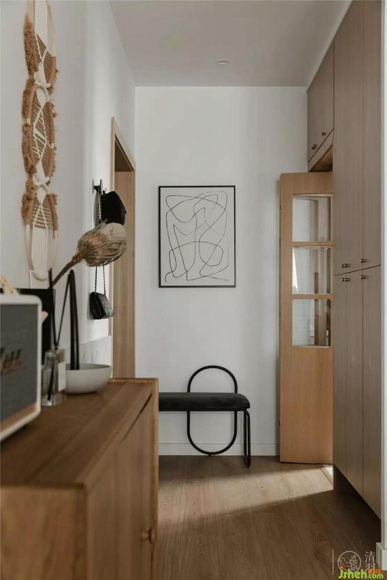 這是一處相對(duì)建設(shè)較早的樓盤,原戶型規(guī)劃上也比較傳統(tǒng),進(jìn)入大門正對(duì)廚房的門。由于套內(nèi)面積不是很大,因此我們?cè)谛P(guān)通道這塊空間相對(duì)容易被浪費(fèi)的地方做了大面積到頂?shù)膬?chǔ)物柜。