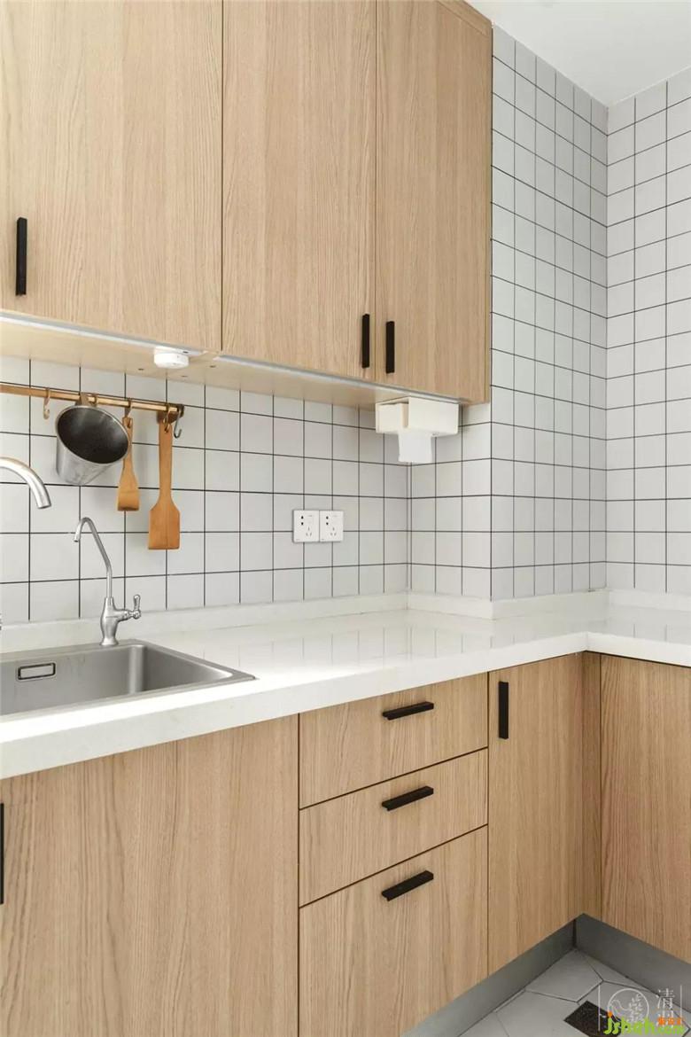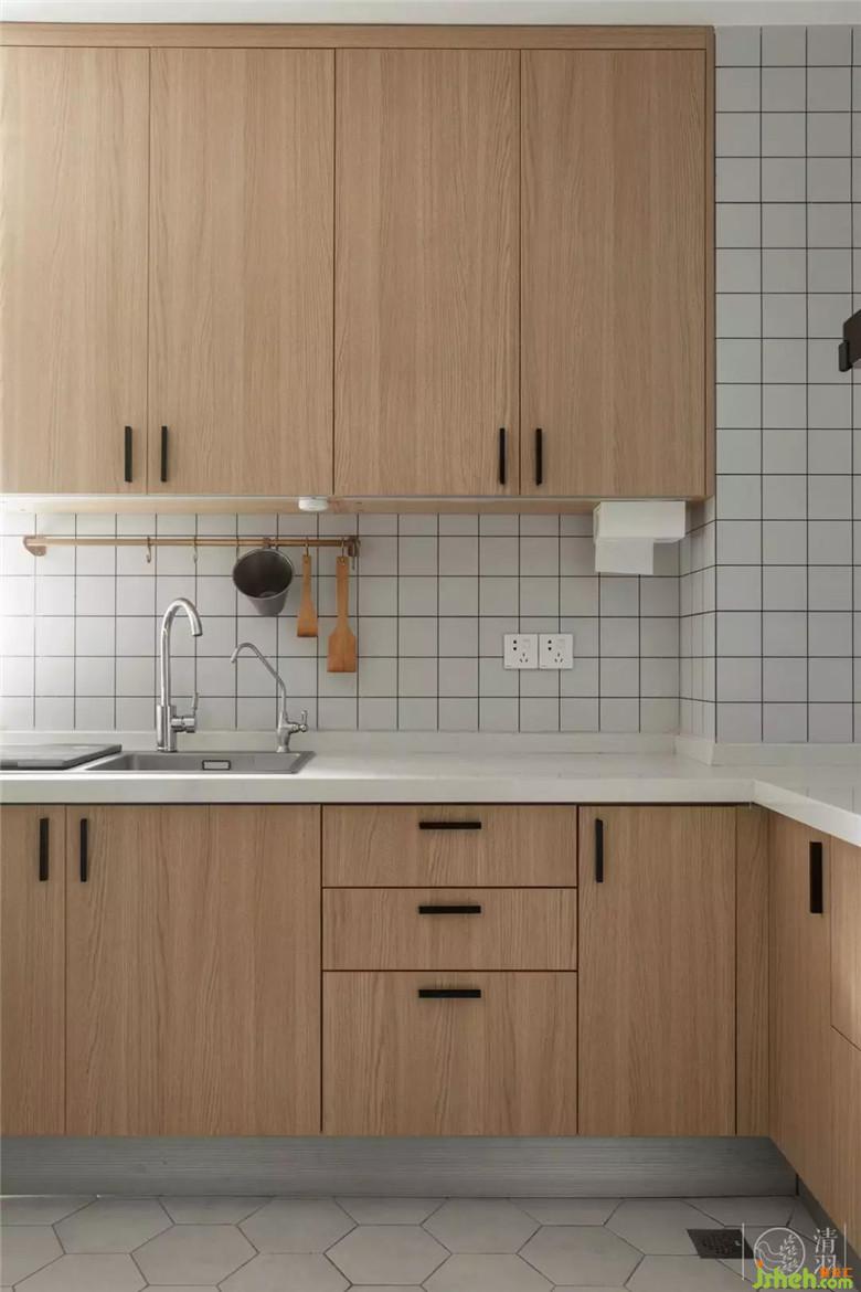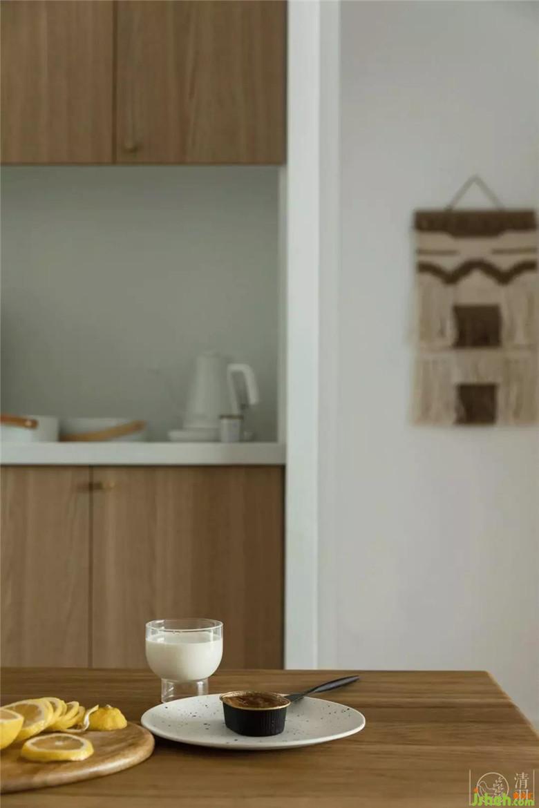暖白色的石材臺(tái)面,原木色的柜體,與主色調(diào)完全呼應(yīng)的配色,讓廚房所有的必備品都顯得非常自然。既有存在感,又好像他們?cè)揪鸵恢痹谀莾海皇堑饶阃崎_門而已。