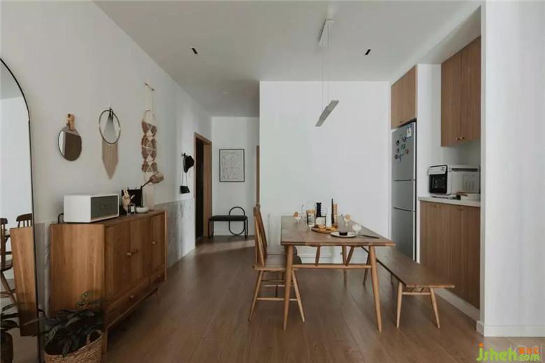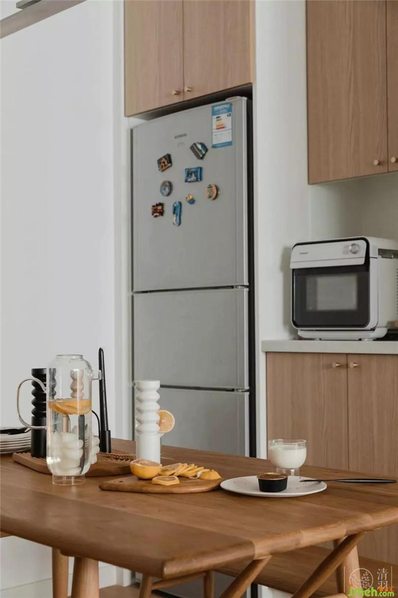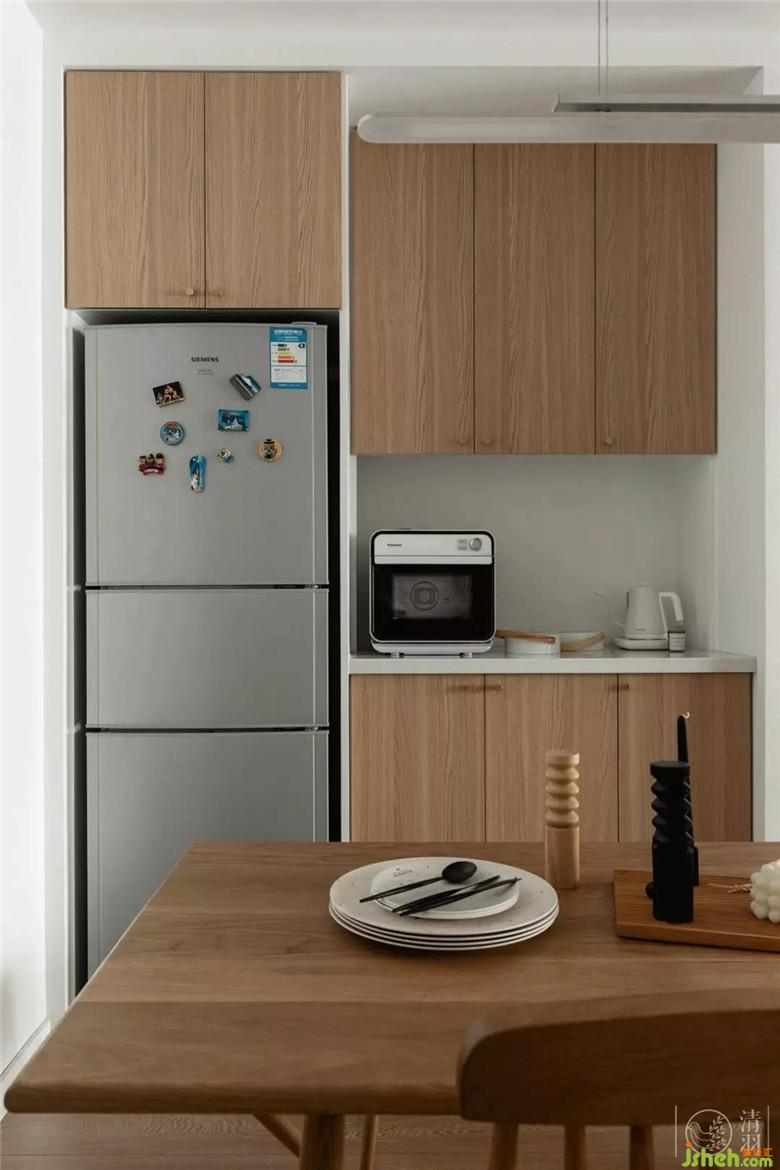 從廚房出來(lái)走過(guò)通道便是餐廳,這個(gè)部分我們也考慮了它的復(fù)合功能性,就餐區(qū)域背后除了擺放冰箱及微波爐,其余空間依然做儲(chǔ)物柜處理。