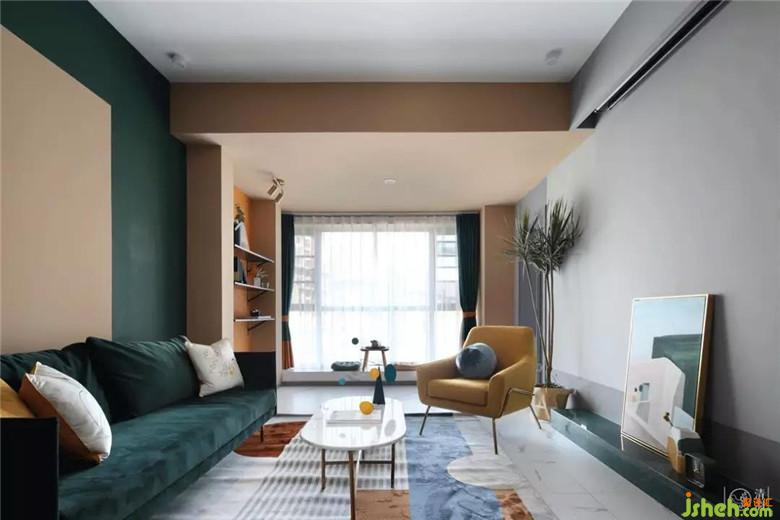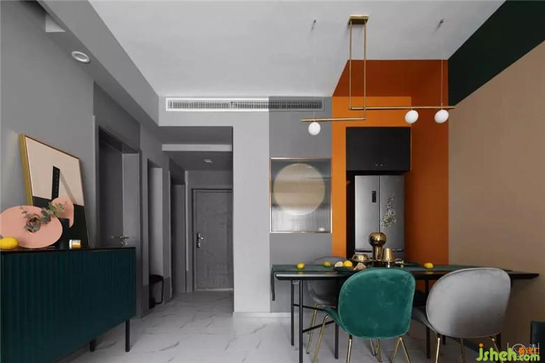 客廳以灰色為主調,將瑪瑙綠、果肉粉、橘子黃與黑白灰色搭配,讓整個客廳呈現(xiàn)寧靜、低奢感。以大面積的灰色、果肉粉墻面在整個空間內彼此過渡融合,用橘子黃、金屬金、薄荷藍、大理石白的家具跳色,賦予整個空間夏意的生機。