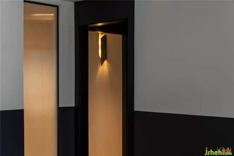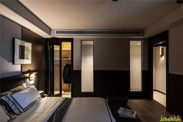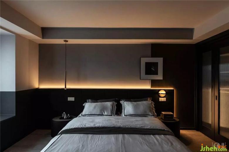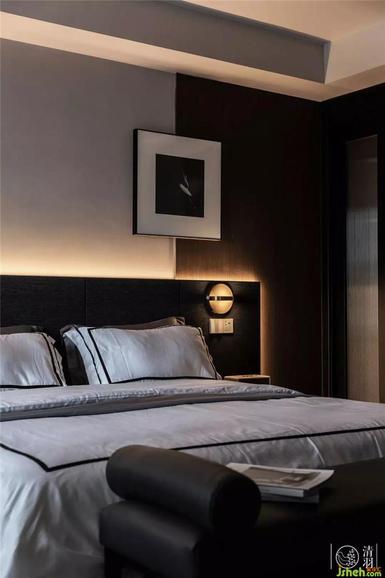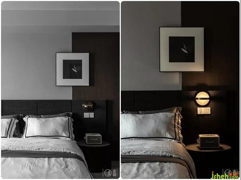 位于二樓的另一間主臥采光不如一樓好,我們在床頭的軟包上做了一點小手腳,用了美線燈和床頭的小壁燈來提升空間氛圍。