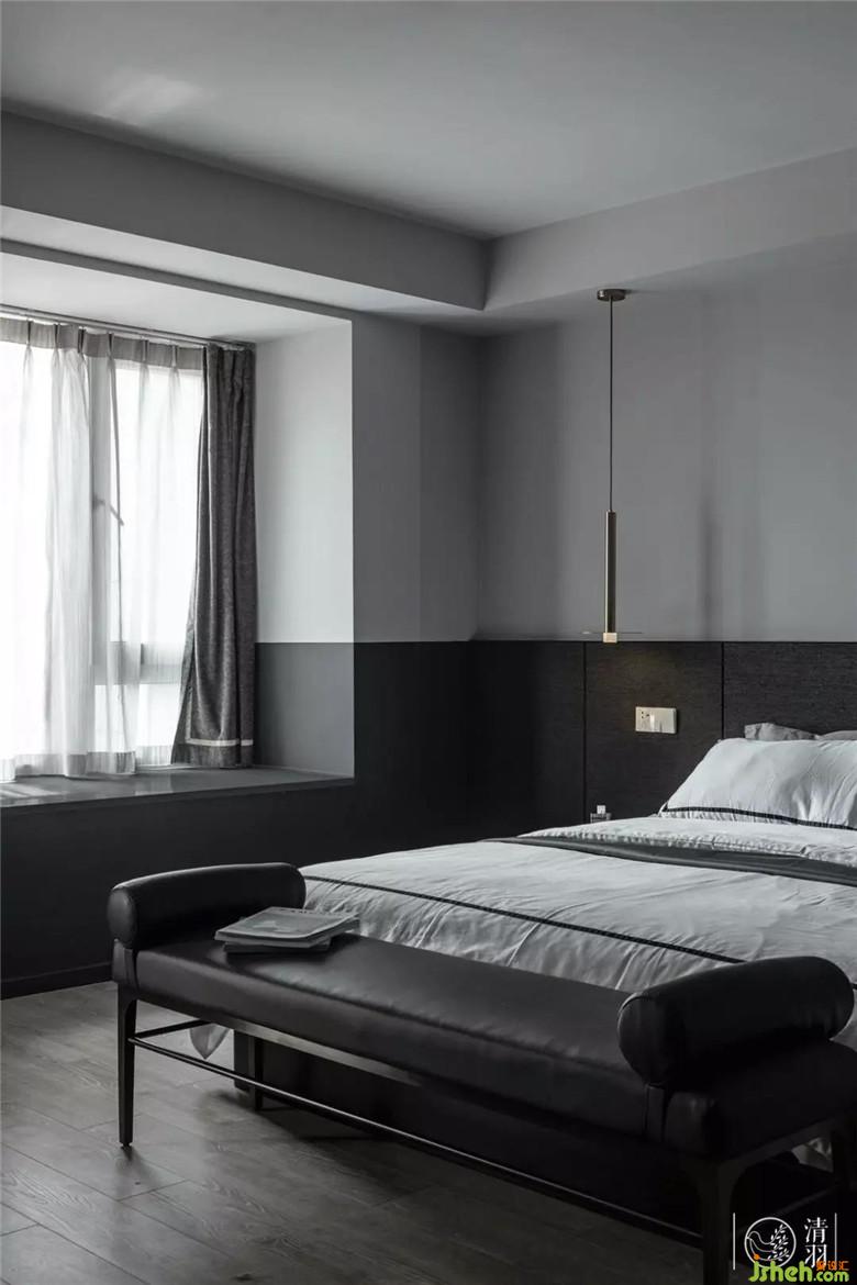 墻面選用了更經(jīng)濟實惠的乳膠漆,上灰下黑的搭配,延伸了床頭軟包的視覺感,也呼應了主題色調(diào)。