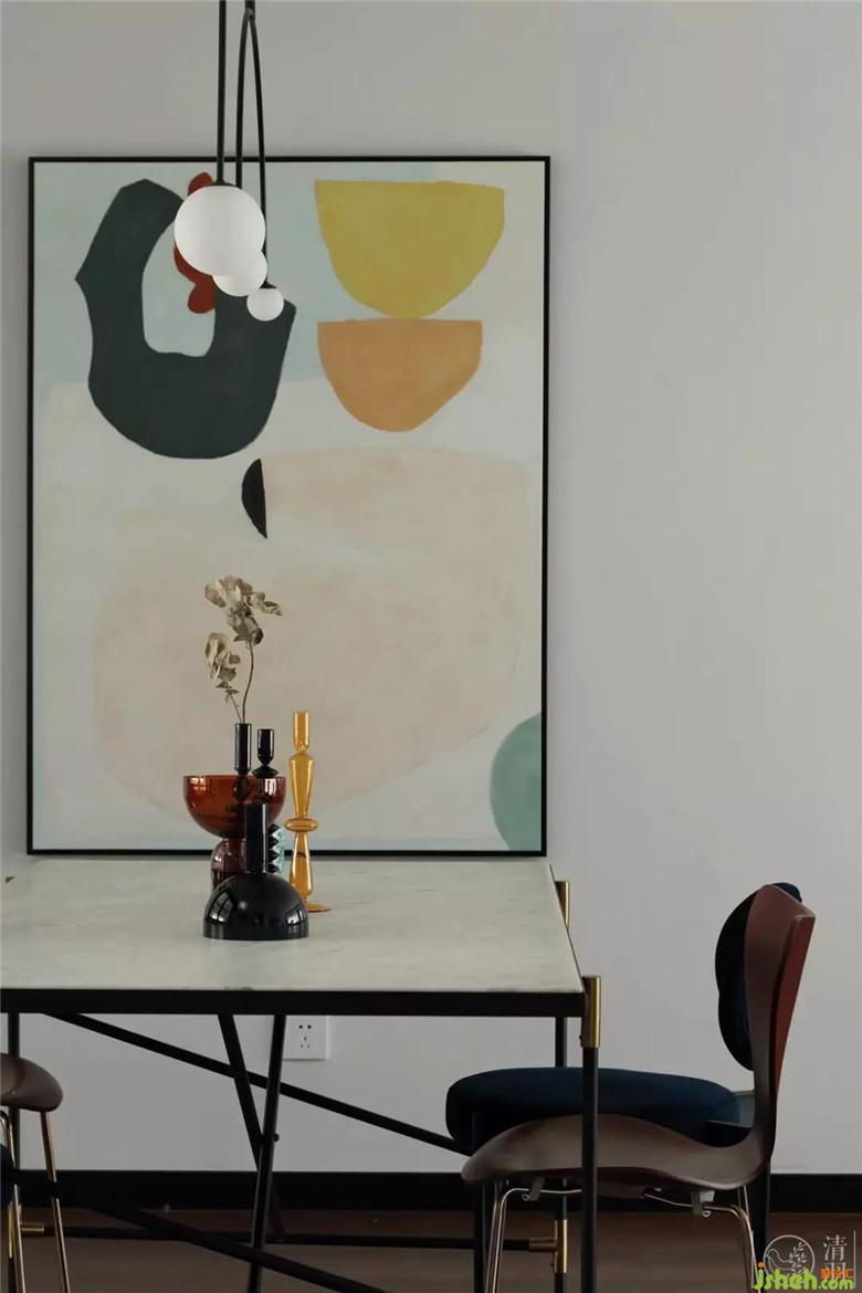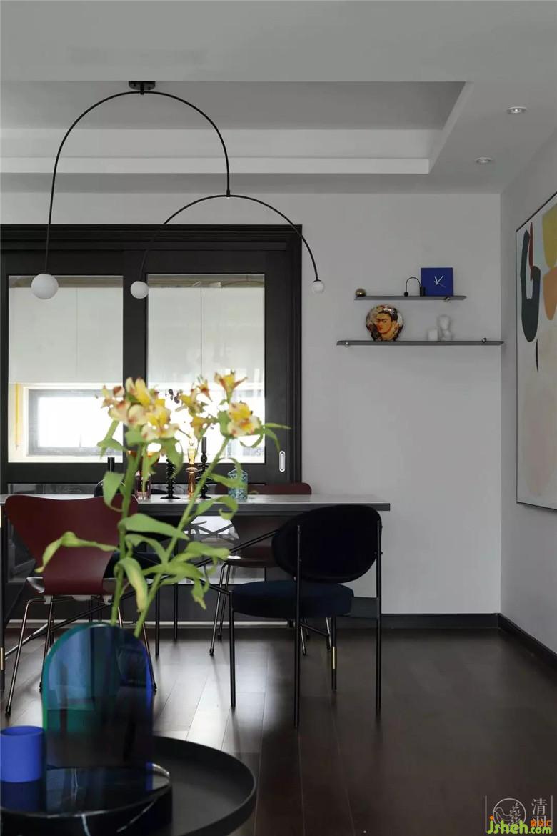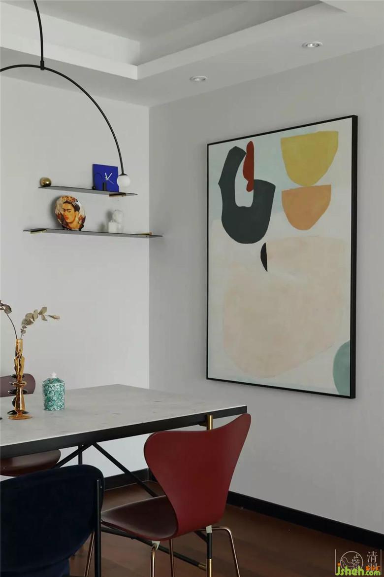 餐廳,穩(wěn)重的白色大理石面餐桌搭配熱情的砂紅色蝴蝶餐椅和深藍(lán)絲絨椅,在硬朗和柔和中間找一個(gè)平衡點(diǎn),動(dòng)靜皆宜,亦室宜家。