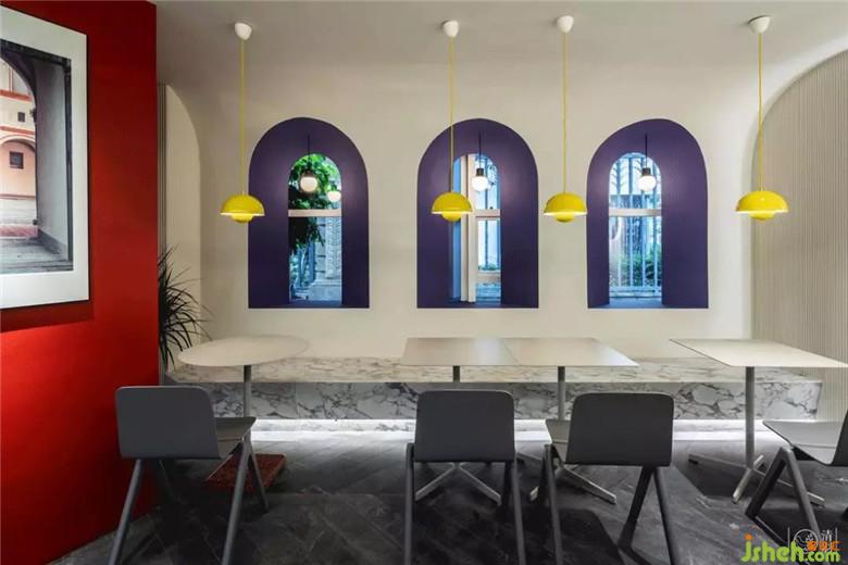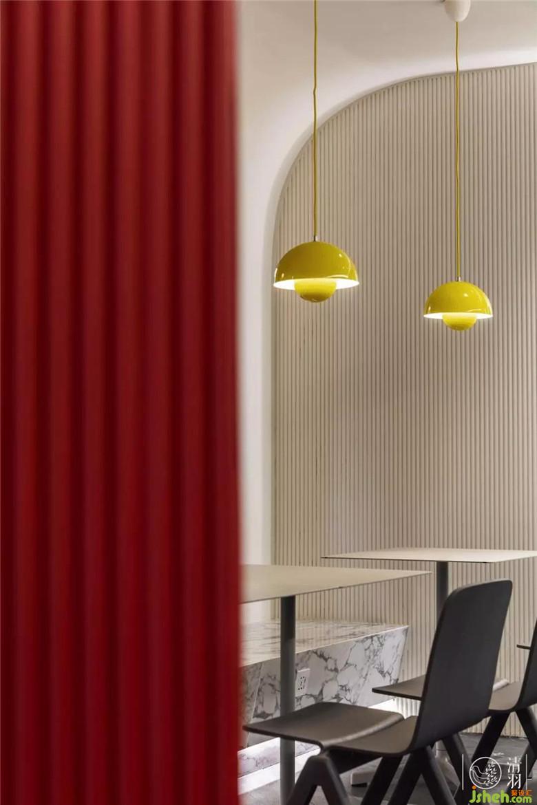 從樓梯的扶手部分開始直至樓上的包間區(qū)域,我們采用了質(zhì)感上乘的夾膠彩色玻璃。特別之處在于它的色彩不是貼膜而來,也因?yàn)轭伾貏e,為此我們也“折磨”工廠數(shù)次打樣,力求它與預(yù)期高度統(tǒng)一。