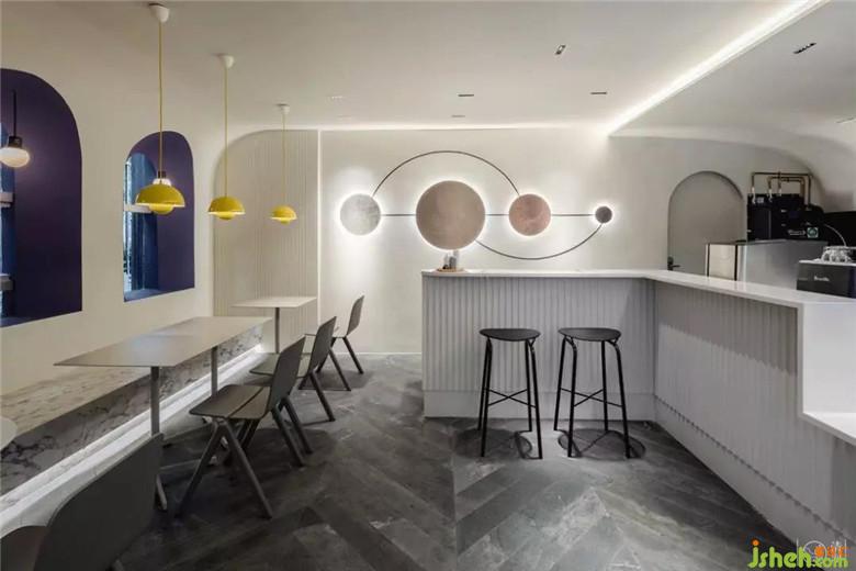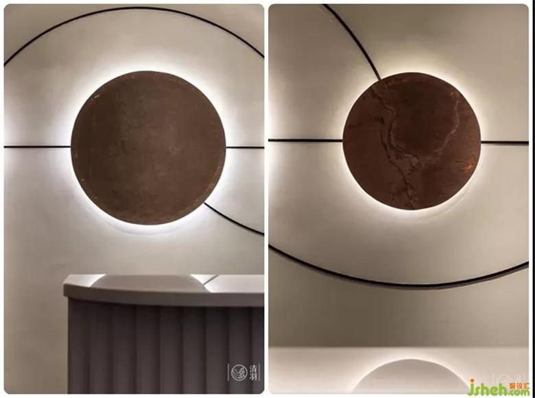 兩個人之間的引力或者“糾纏”,我們稱之為“愛情”,而萬物間的“糾纏”形成了宇宙,它的奧秘人類從沒有放棄探尋。于是,在這樣一個可宏觀可微觀的空間里,在歡聚的桌旁(也是正對大門)的背景墻上,我們用超薄石材、金屬線條組合,進(jìn)口涂料打底做了一組似乎遵循著某種軌跡相互牽制運(yùn)動的星球裝置。