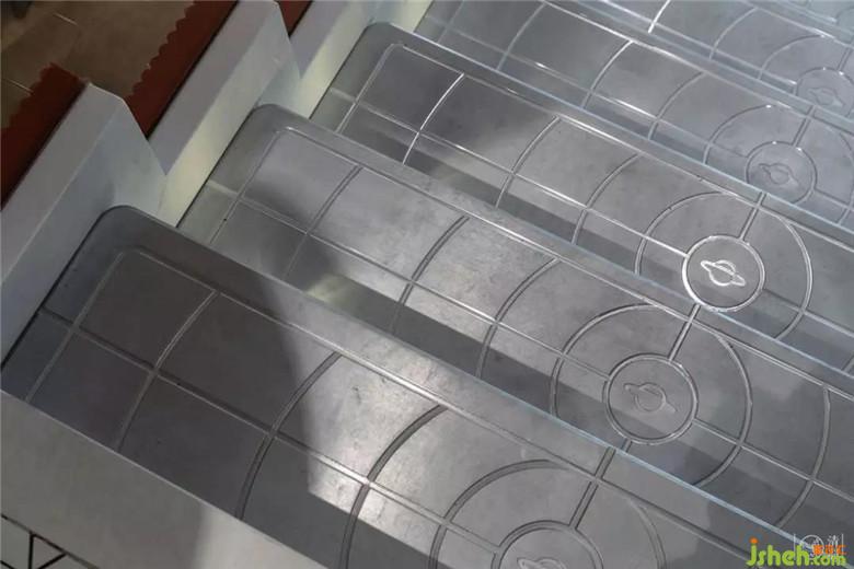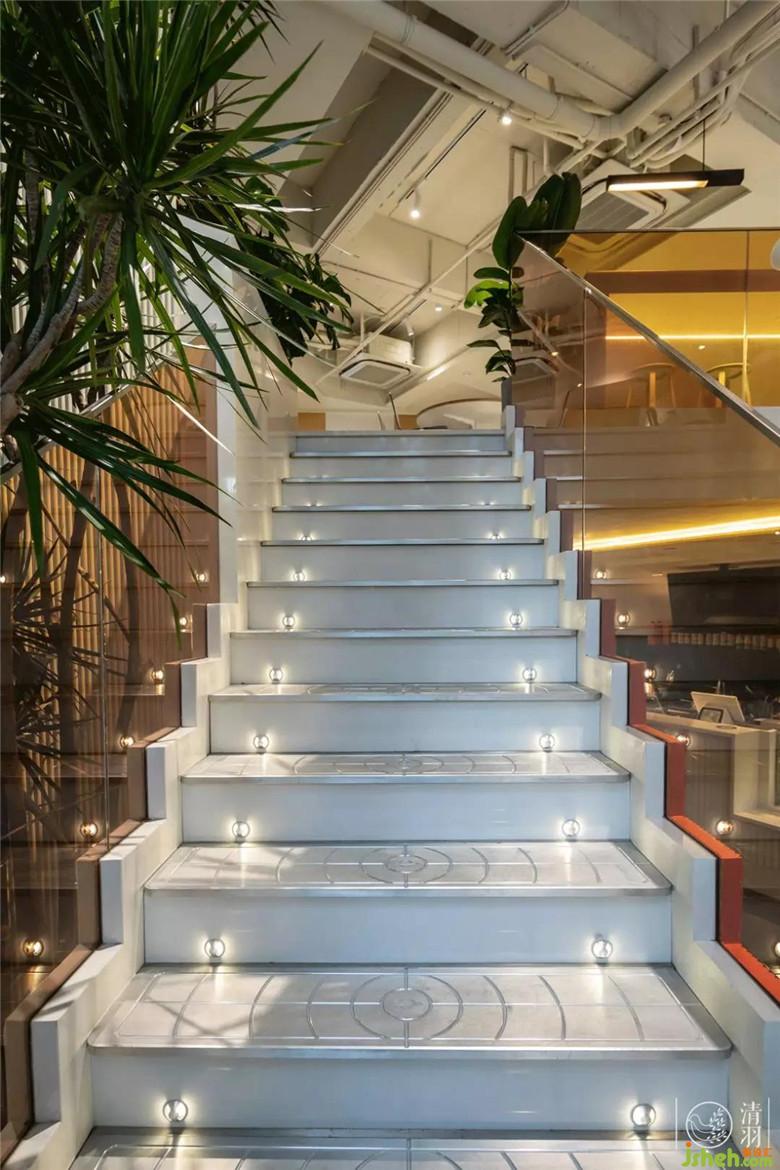 20mm厚的鋁板,結(jié)合Logo定制圖案,出圖送工廠打樣,最后篩選出性價比最高的方案,由此引力食間擁有了“私人訂制”的梯步。因?yàn)楦叨日?,做?2階踏步(貌似不小心帶入了圣斗士十二宮的傳說),定制科瑞燈珠以側(cè)出光的方式,打造一種飛船梯步的感覺,聽說完美的質(zhì)感也能加速多巴胺分泌。