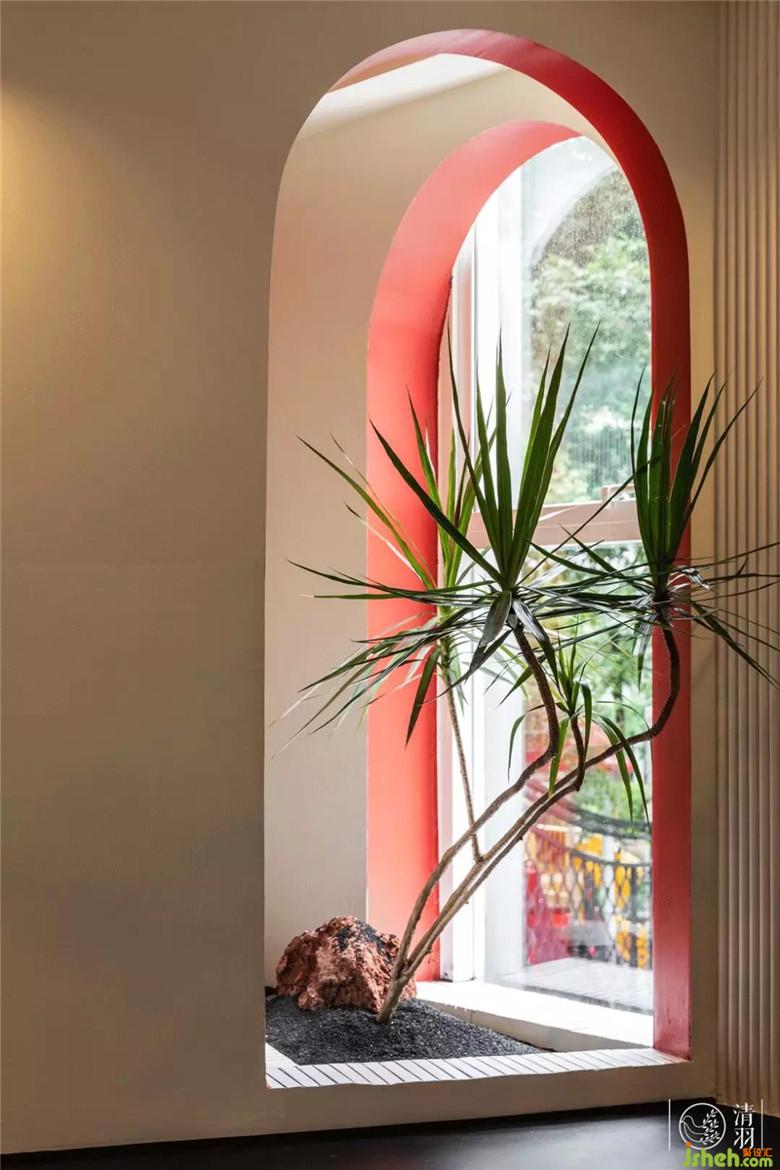 這里的弧形窗洞,為了避免一室多處重復(fù)造成審美疲勞,幾經(jīng)挑選,安置了一株造型特別的龍血樹,營造出一種荒漠重生的感覺。