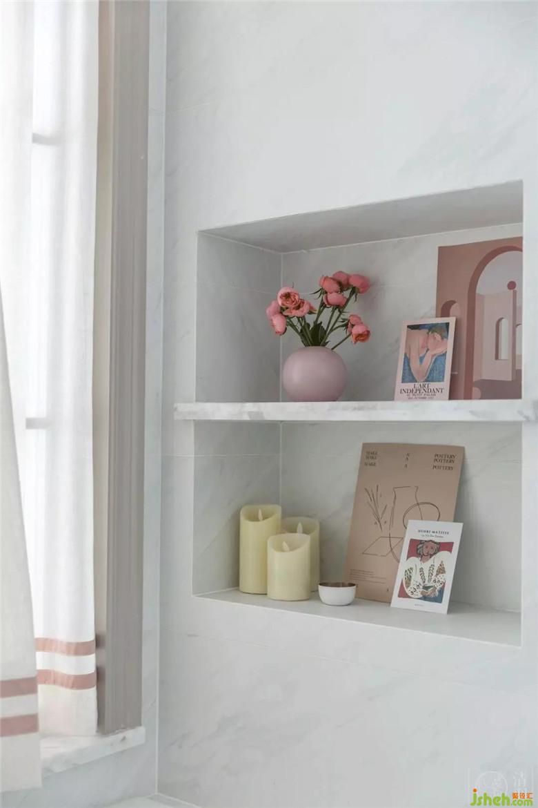 臟粉色的淋浴區(qū),讓空間不僅僅只有白色。