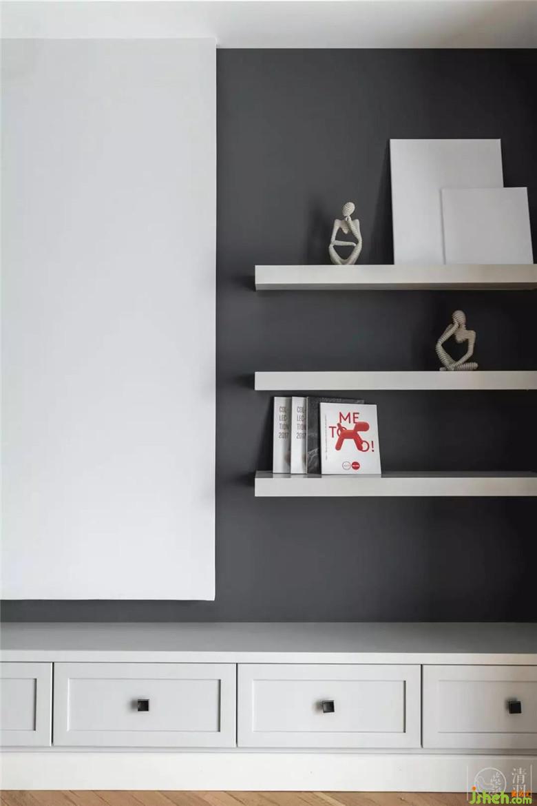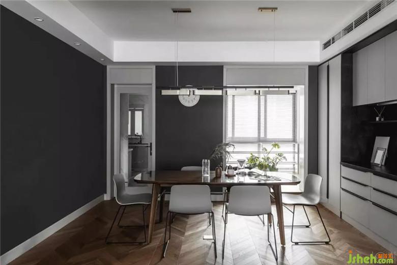 餐廳區(qū)域,墻面用黑色乳膠漆,和黑板漆呼應,在轉角做了分色處理,用簡單的辦法增加圍合感,墻面基本沒有淺色卻絲毫不顯突兀。