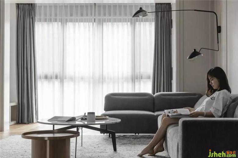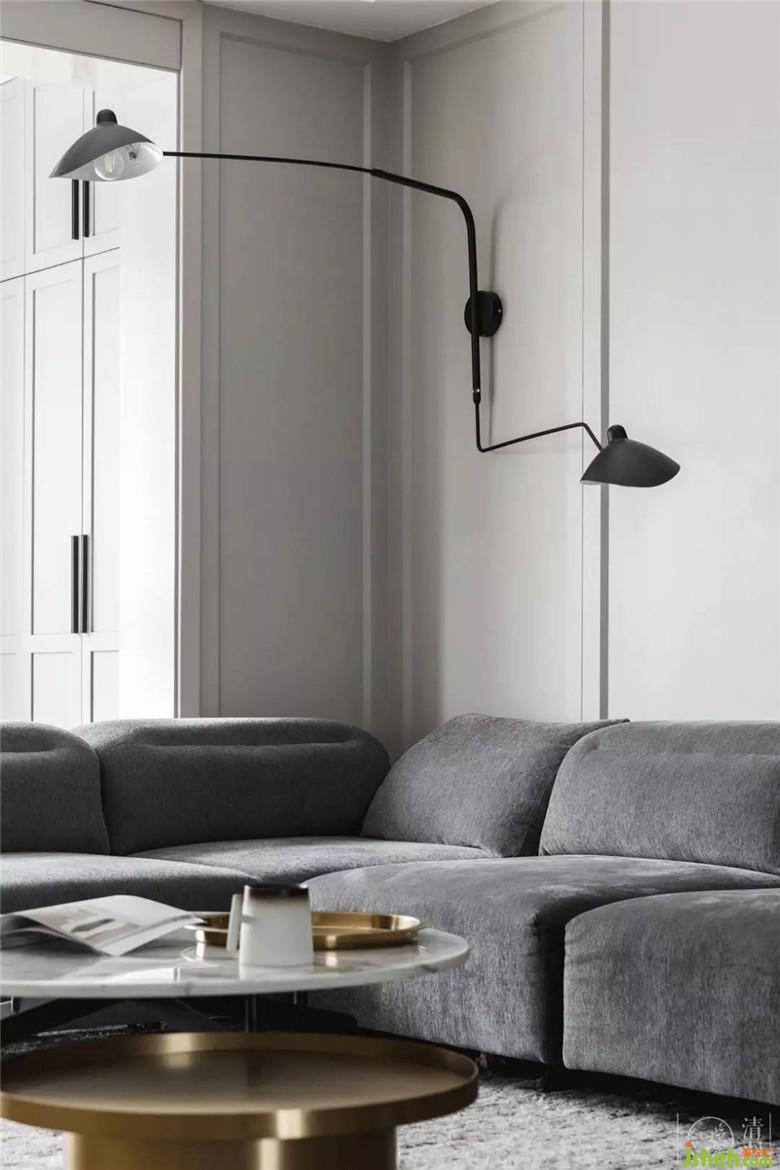 我們沒有給客廳設置主燈。而是在沙發(fā)一角的墻上,裝置了帶實用性的氛圍燈。以此來避免打破整個空間的平衡,也能盡可能不會影響投影幕布的使用。