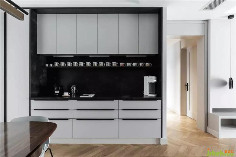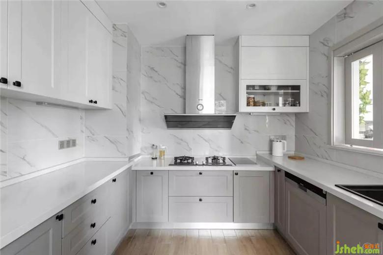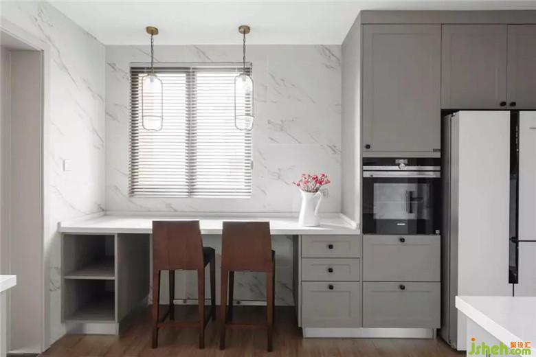 廚房部分以淺色大理石紋理的進口瓷磚貼面,既能讓充滿生活氣息的空間顯得干凈清透,其本身也獨具易清潔好打理的特性。在柜門的顏色上做了與整體空間的深淺過度,讓淺色的空間可鹽可甜。