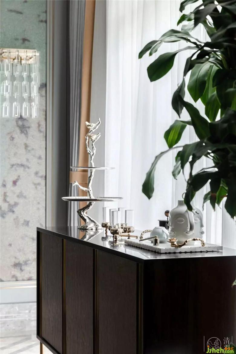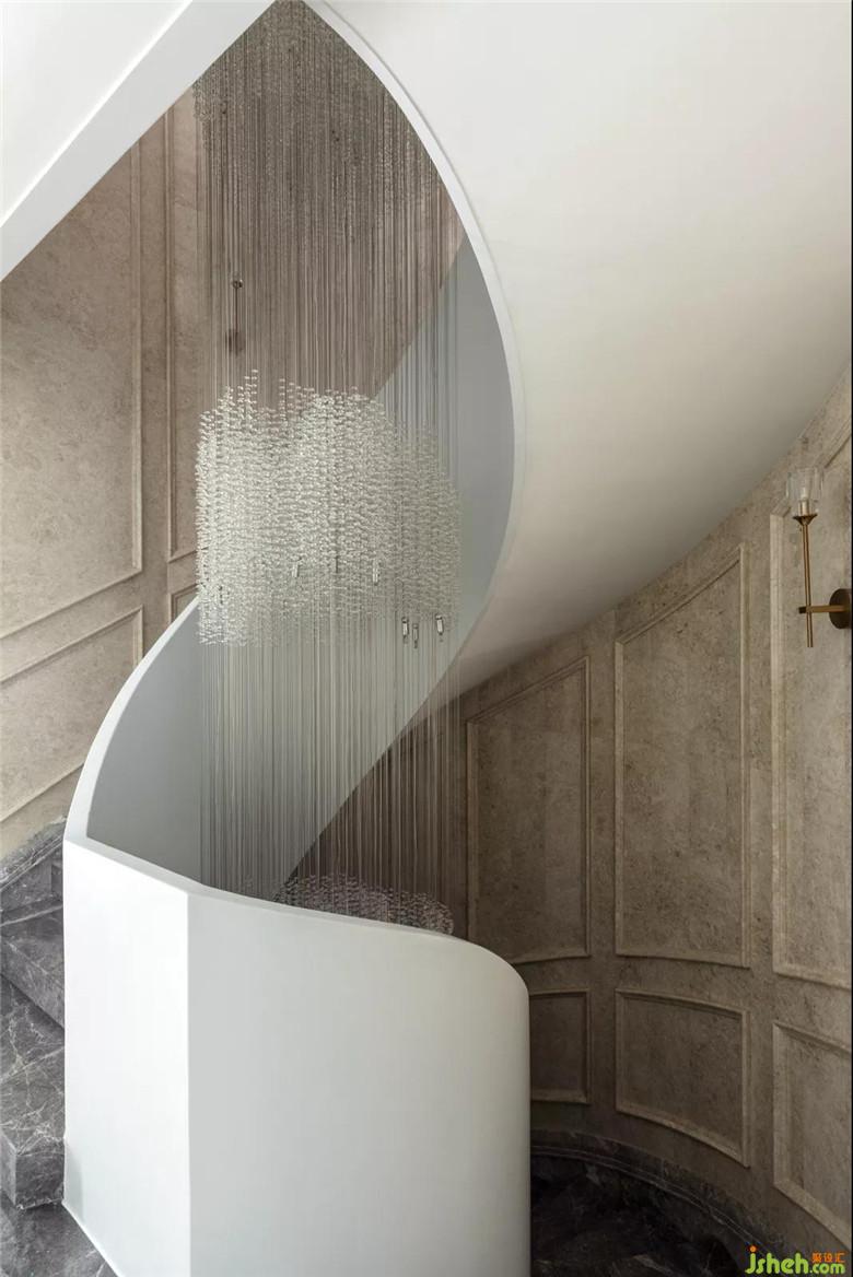 這一次的走廊、樓梯間,我們小心的打破陳規(guī),采用旋轉(zhuǎn)式樓梯加白色鋼板流線型的扶手設(shè)計(jì),由房屋內(nèi)最高處墜下的瀑布式水晶燈貫穿其中,搭配深灰色的石材貼面旋轉(zhuǎn)樓梯以營(yíng)造出高級(jí)的夢(mèng)幻感。既優(yōu)雅知性,又夢(mèng)幻得似有精靈穿過,就像屋主夫婦和乖巧的女兒們給人的第一印象。