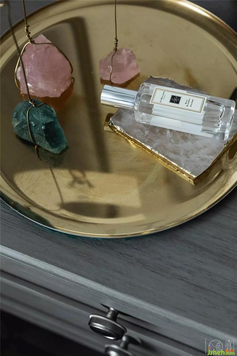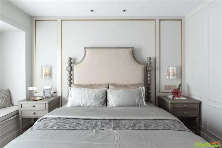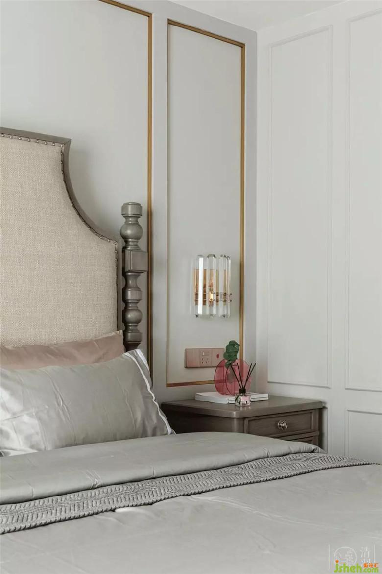 整個主臥室素雅安靜,局部使用了護(hù)墻板加金屬線條,增加空間的精致感。