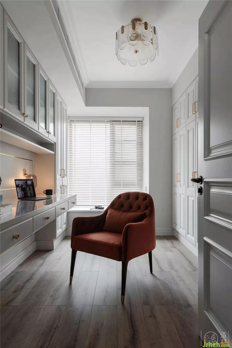 和主臥室相呼應的護墻板加金屬元素貫穿書房,強大的收納功能無處不在。