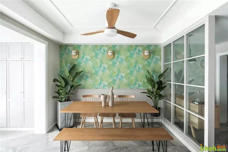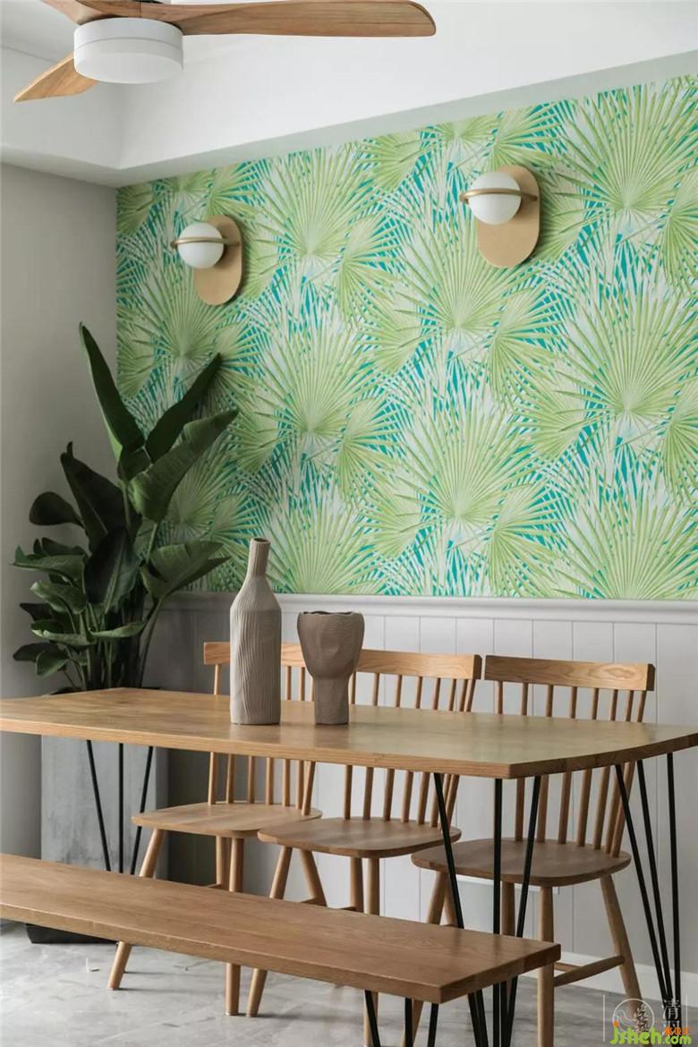 植物背景的墻紙和原木色的餐桌椅、風扇燈讓餐廳的氛圍輕松愉悅。