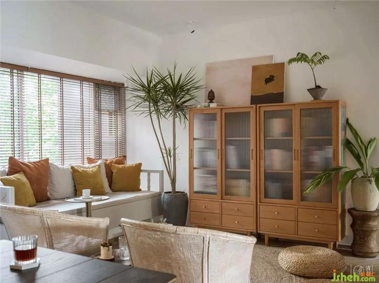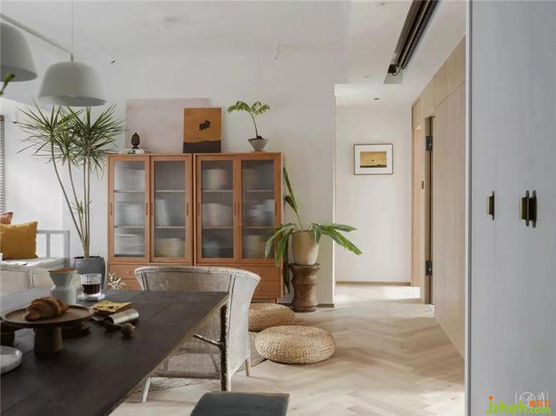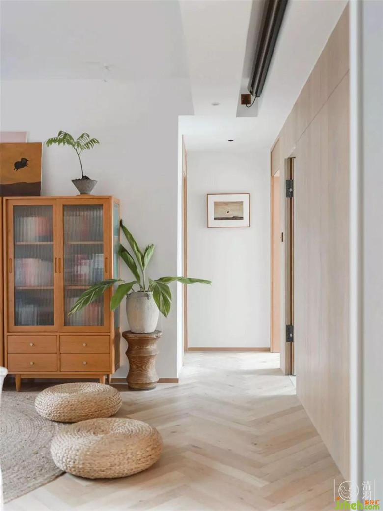 柜體與白色的墻面,頂面延伸出流動(dòng)的功能動(dòng)線,換好拖鞋的業(yè)主抬頭,入目便是有著斑駁光影的原木色柜子與綠植,恍然走入陽光明媚,葉影婆娑的清邁小巷,轉(zhuǎn)角既是一片廓落庭院。
