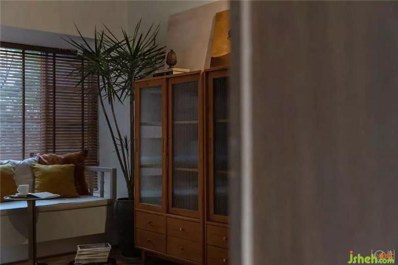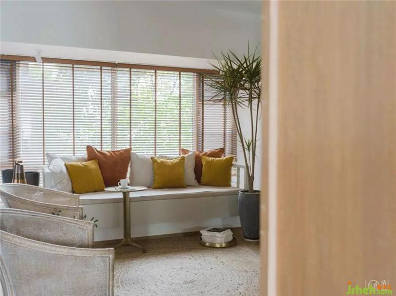 豎廳改橫廳!打破它3.3米的常規(guī)布局,拓寬客廳開(kāi)間至4.4米!以最大限度利用空間同時(shí)降低空間飽和程度為目的,飄窗干脆改“沙發(fā)”!電視墻太雞肋,摒棄!僅用木質(zhì)百葉窗代替厚重的布藝窗簾,在保障隱私的前提下,給自然光極大地尊重,并以此呼應(yīng)草編的地毯與蒲團(tuán)。茶幾,太阻礙情感交流,也去掉,給圖圖寶貝更大的活動(dòng)空間也能接納更多的親朋好友!