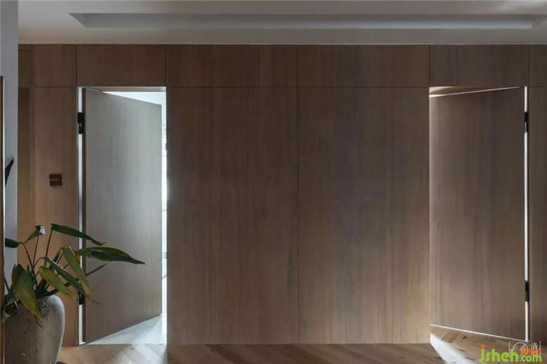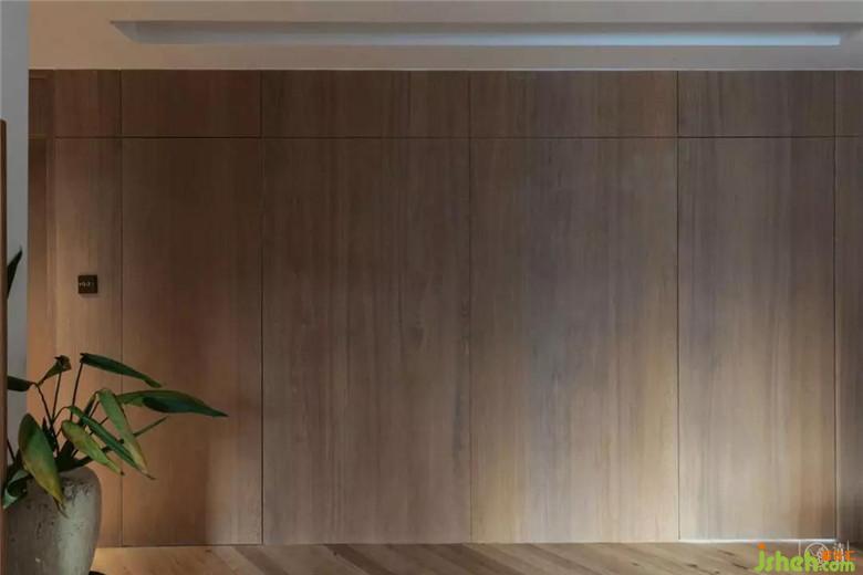 我們以到頂?shù)脑旧b飾面板上墻,巧妙地將次衛(wèi)與通向陽(yáng)臺(tái)房間的墻面做成隱形墻,關(guān)上門即刻化身超大投影幕布背景墻。