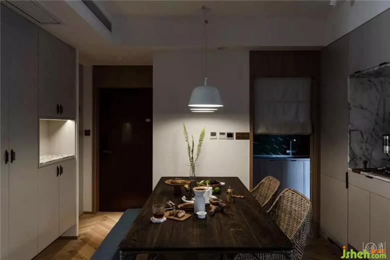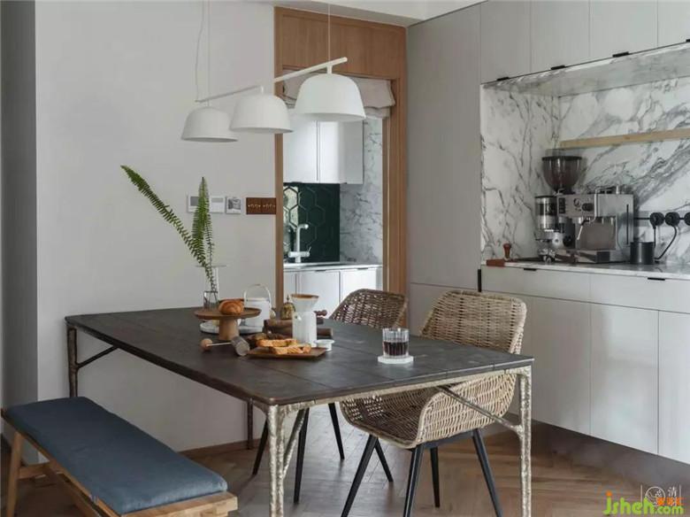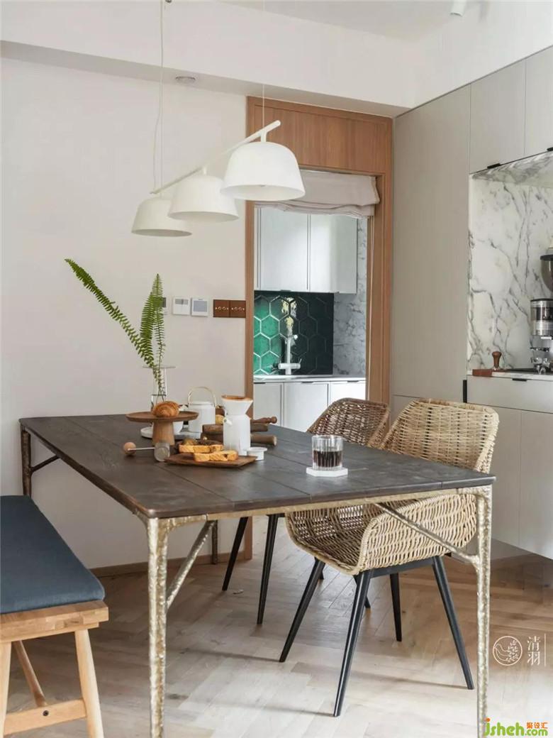 餐廳作為客廳的一部分,我們沒有做特殊的處理。將冰箱徹底隱身在餐桌后的墻體中(內(nèi)嵌式料理臺左側),節(jié)省空間的也消除大電器在自然系空間氛圍中的違和感,擺放上帶點粗礦感的英國Square roots橡木鐵藝餐桌,壹集藤編餐椅和布藝原木的雙人條凳,原藤原木搭配深褐色,大概一眼就能讓人聯(lián)想到東南亞的海邊餐廳吧。