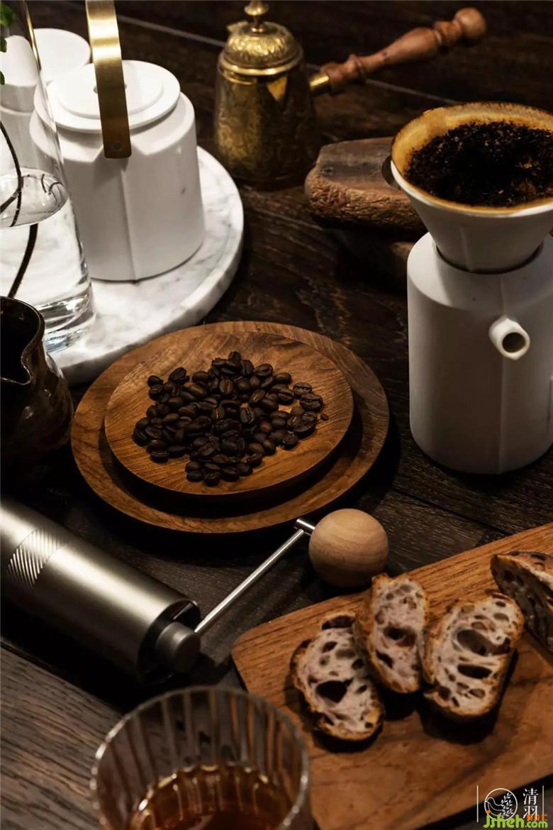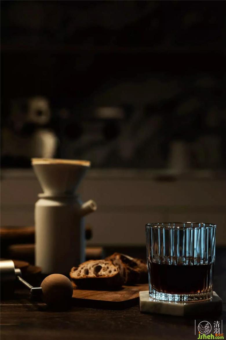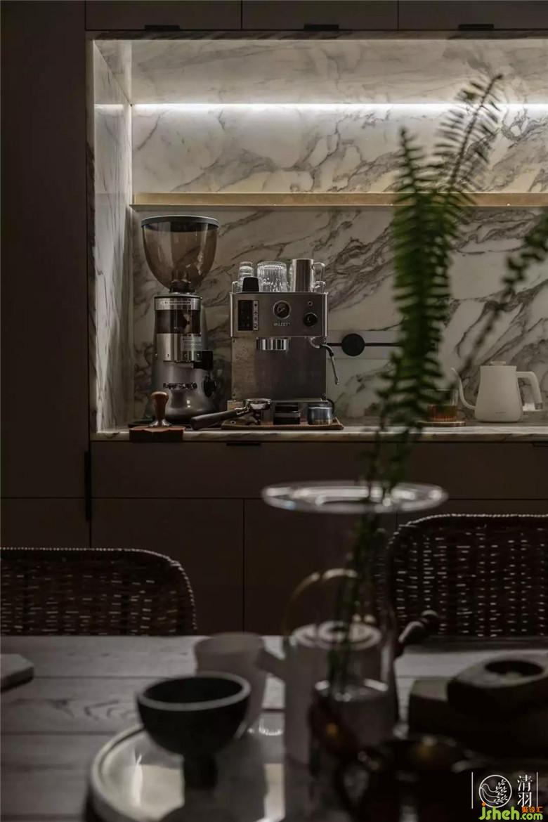 餐桌背后與廚房銜接的墻面,切割出一個嵌入式料理臺,前衛(wèi)而實用。放置上常用的咖啡機、手沖壺,方便日常使用的同時也再次強調了整個空間的“輕松休閑”感。