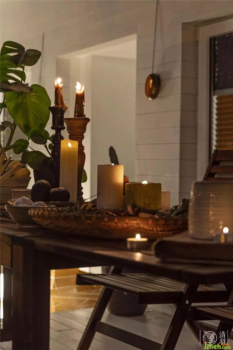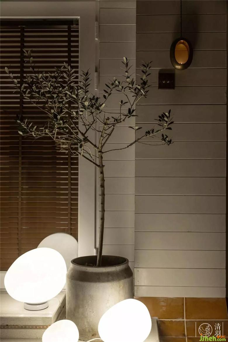 半開放的玻璃頂,擋風(fēng)擋雨,引入陽光和自然之氣,墻面利用白色深度碳化木,折射出光的熱烈,潔凈而溫情;深度碳化的木地臺(tái)上,陶土罐里的仙人掌、尤加利、橄欖枝條、龜背竹向光而生,遠(yuǎn)方的叢林也不過這樣吧。