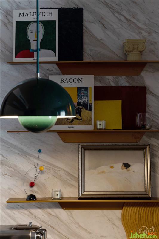 餐廳吊燈是來自&Tradition,深綠色的燈罩、油漆的光澤度和絲絨面料的黃綠撞色餐椅很好的呼應(yīng),圖案、肌理和色彩就這樣在空間里述說著關(guān)于熱愛的故事。裝修設(shè)計(jì)