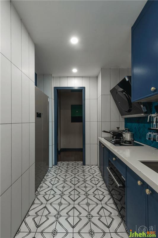 一字型狹長的空間需要在色彩和線條上制造輕盈感,才能讓空間更大更放松,簡潔的長方形白色瓷磚做墻面鋪貼,拉長空間縱深,幾何菱格的復(fù)古瓷磚做地面拼貼,制造躍動錯覺,甚至門外的“風(fēng)景”,整個廚房就這樣變大,變寬了。