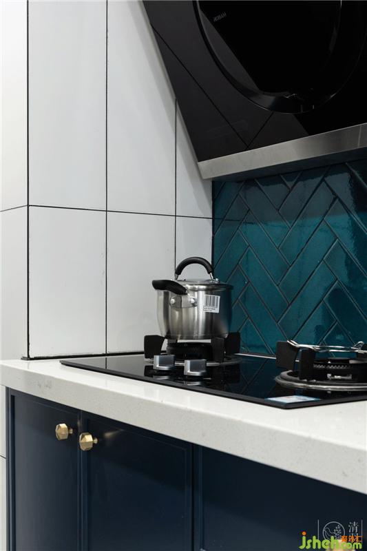 灰藍(lán)色訂制櫥柜干凈雅致,人字拼的水波感孔雀綠瓷磚讓這個小天地也暗藏一絲調(diào)皮的夢幻。