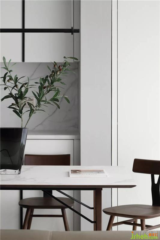 開放式的空間布局,使客廳和餐廳兩個空間之間相互貫通、相互融合。餐廳里我們用白色櫥柜將空間進(jìn)行延伸,用木質(zhì)的餐桌座椅以及家具拉手的黑色線條去緩解了空間里大面積白色帶來的清冷感,也將客廳與餐廳有效的進(jìn)行了融合。