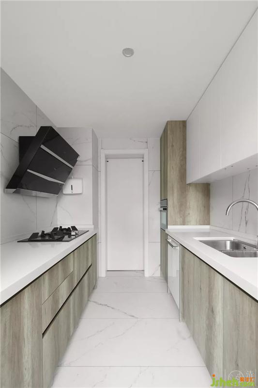中西文化多種多樣,東方傳統(tǒng)文化與西方現(xiàn)代文化各自獨(dú)立又兼容并蓄。所以在飲食上,考慮到中餐和西餐的做法不一致,廚房的空間有限,我們將中廚區(qū)獨(dú)立設(shè)計(jì),中西廚區(qū)分屬為兩個陣營,中廚區(qū)繼續(xù)沿用客廳風(fēng)格,整體以白色、木色為主,用黑色拉手、黑色家電點(diǎn)綴其間,彰顯著空間簡單大方的空間氛圍,并且在空間兩側(cè)采用一字型的操作臺,有效的將操作空間進(jìn)行了合理劃分,最大限度增加了廚房的收納空間。