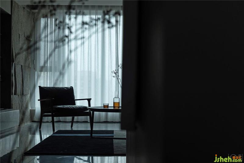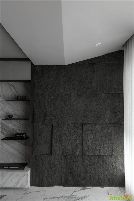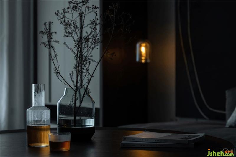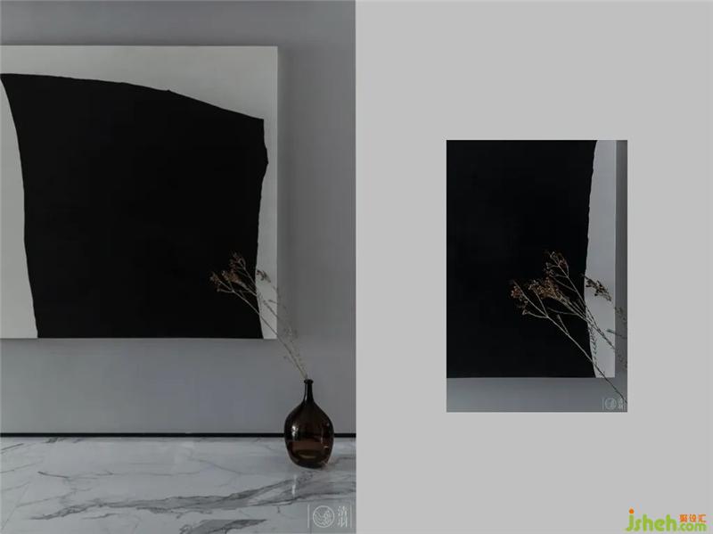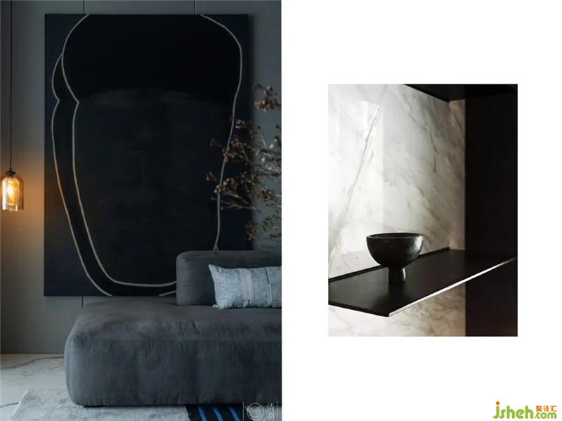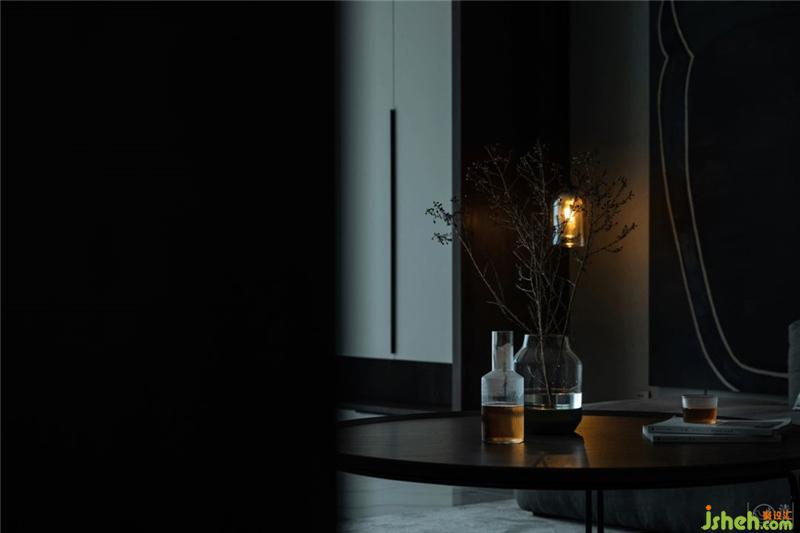HAY的錫器灰色布藝沙發(fā),黑灰相間點(diǎn)綴的地毯,我們畫好圖然后特地找藝術(shù)家定制的油畫作品,Stellar works咖啡色茶幾和黑色邊幾以及造型沉穩(wěn)大氣的木質(zhì)軟包休閑椅、現(xiàn)代精致工業(yè)風(fēng)的磁吸燈,極簡的壁爐裝飾,幾塊預(yù)先裝入電視背景墻的黑色鋼板……幾乎十指可以數(shù)完的裝飾,恰到好處地豐富了空間的層次感。