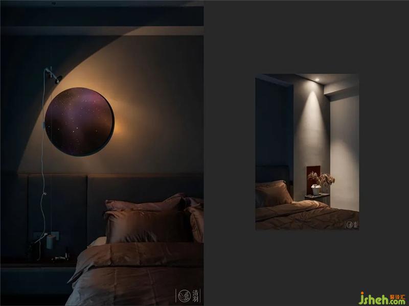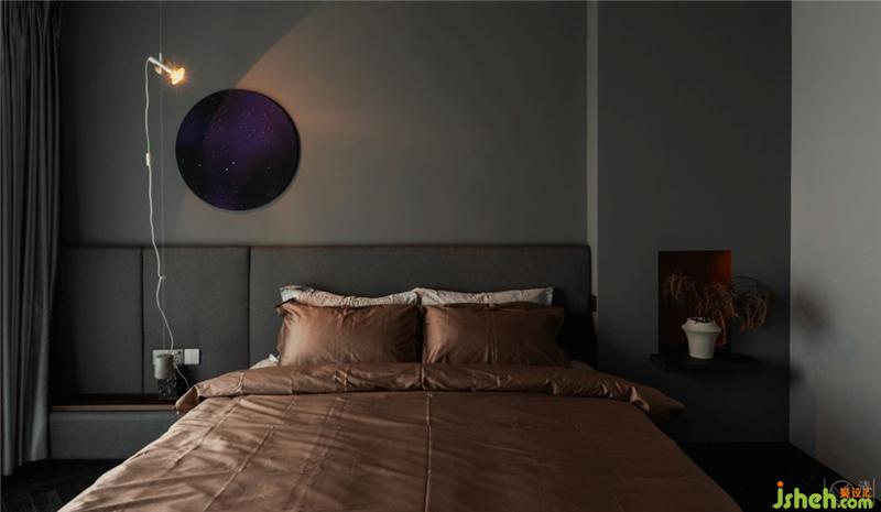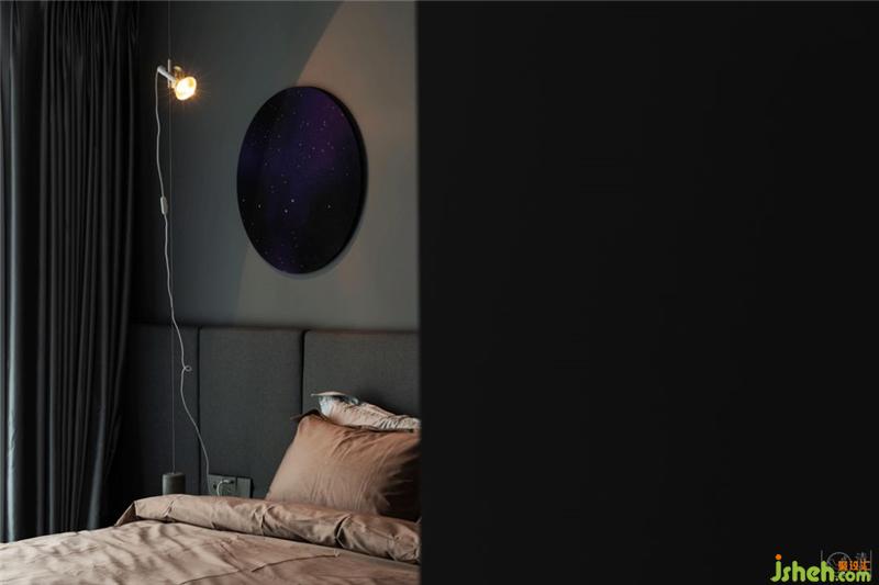 整體定制的床頭與床箱配上德國原裝的WULFF沃福床墊,預(yù)先嵌入墻體的置物板,可以裝飾也可以置物的壁龕,能上下滑動、滿足不同生活需求的瑞典Pholc Blend混凝土Led吊燈,以及一塊星空藝術(shù)裝置,一張柔軟的白色地毯,就是為數(shù)不多的裝飾了。