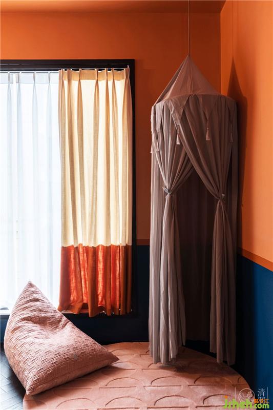 女兒房以橙藍(lán)對比色營造出空間輕松明快的氛圍,迷你的拱門圍繞成床的圍欄,又帶出一點(diǎn)騎士堡既視感,希望小姐姐能在這里成長成一位勇敢的“公主”。