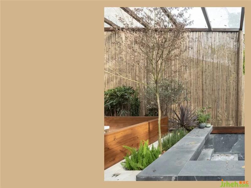 考慮到安全和日后使用的便利,我們對花園做了半封閉處理。鋼架加隔熱夾膠玻璃對休閑區(qū)域的遮蓋,既能保證光照的通透也能避免萬一的高空拋物。立面部分以巖板貼面的半墻結(jié)合定制的到頂竹籬笆,兼顧私密性與良好的自然通風。并利用階梯、花臺、座椅的靠背,做出空間的層次感。