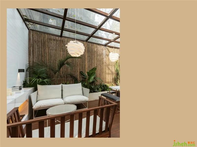 整個花園設(shè)置了兩個部分的休息區(qū),靠樓體的墻面用了大面積的深度碳化木刷成簡單干凈的白色,搭配恣意生長的觀葉綠植、線條簡潔的木質(zhì)長椅、白灰色的棉麻布藝沙發(fā)和Umage Vita Copenhagen Carmina海浪燈……不知道有沒有能給你海風拂面的感覺呢?