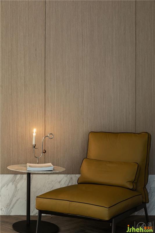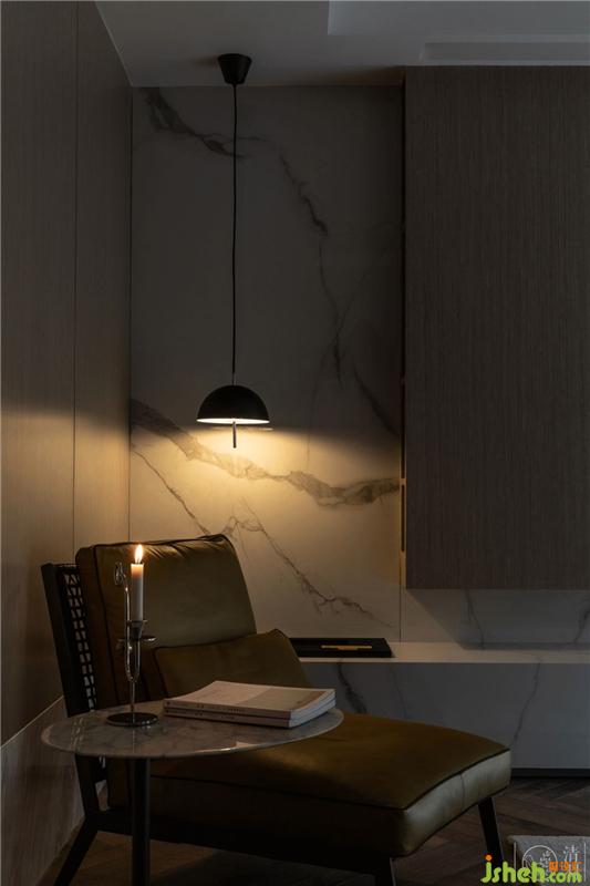 在沙發(fā)另一側(cè)對角,我們以線條簡潔著稱的瑞典Globen Lighting的吊燈與CAMERICH銳馳的休閑椅為重點(diǎn)做了一塊休閑閱讀區(qū)。CAMERICH銳馳的PEBBLE茶幾上放著限量款的Nagel無盡系列燭臺,我們想愜意、優(yōu)雅一定是這一塊設(shè)計(jì)的關(guān)鍵詞。