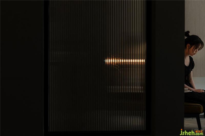 在這一塊區(qū)域的一墻之隔是一層的衛(wèi)生間,旁邊則是餐廳部分,我們借助原本的墻體,加入長虹玻璃同時(shí)也呼應(yīng)入口處的設(shè)計(jì)也做了一個(gè)空間分隔裝置。室內(nèi)設(shè)計(jì)師