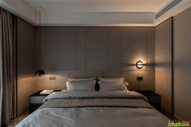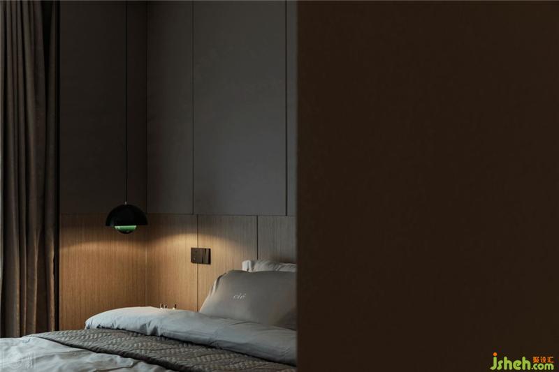 休息區(qū)域以Eno Studio_ Plus的壁燈與& tradition的吊燈作為兩側(cè)的床頭燈,左右一橫一豎的線條也正好與墻飾面板呼應(yīng)出層次感。